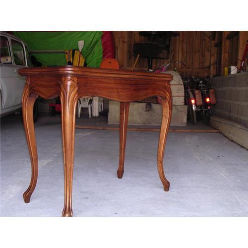 Louis XV style table de jeux in walnut. Can be used as a console table then transformed into a game table. To do so the back legs pull out (functions as a drawer to hold the game pieces) and the top of the table folds over it. The felt top needs to be replaced either by another piece of felt or leather. I would be happy to get quoted to have this done. The walnut veneer on the top surface is in a lovely diamond shape. One small mark on the top due to what I am to assume humidity (please see photo.) Cabriolet legs are simple yet very elegant. This table de jeux is in good condition except for te minor imperfections mentioned above. Please feel free to request more detailed photos. Imported from the Sarthe region of France