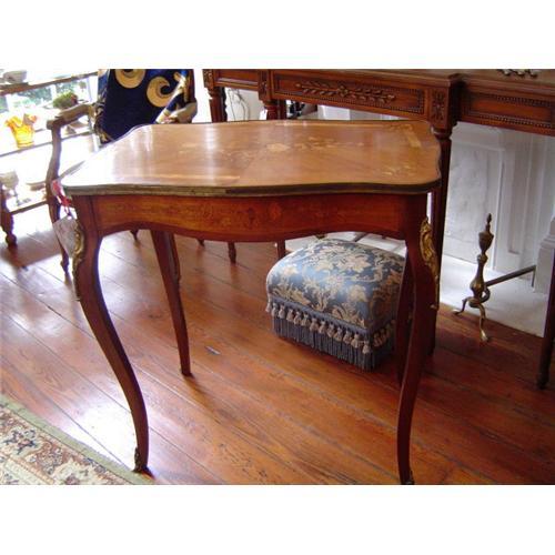 a Louis Xv mahogany , kingwood , marquetry and bronze-mounted side table . the sepentine top with bronze solded edge , inlaid beribboned flower sprays , conforming apron and cabriole legs . gorgeous .