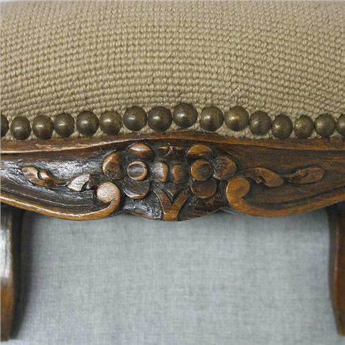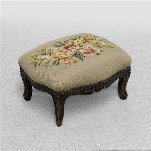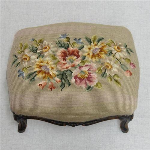 Louis XV style footstool with needlepoint foot rest; floral carving at knees; slight cabriole legs; brass tacks around foot rest; centered floral design on needlepoint; C.1900; 8" high x 15 1/2" x 14"; no visible defects