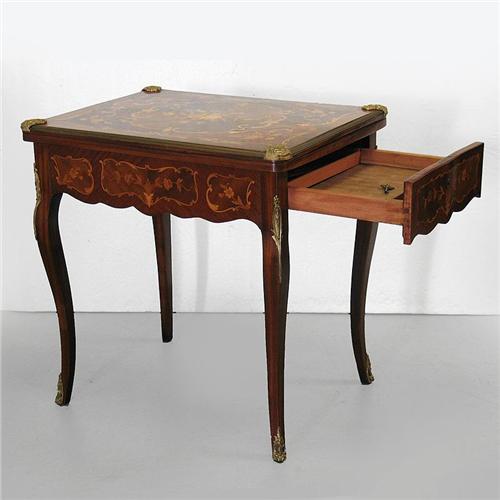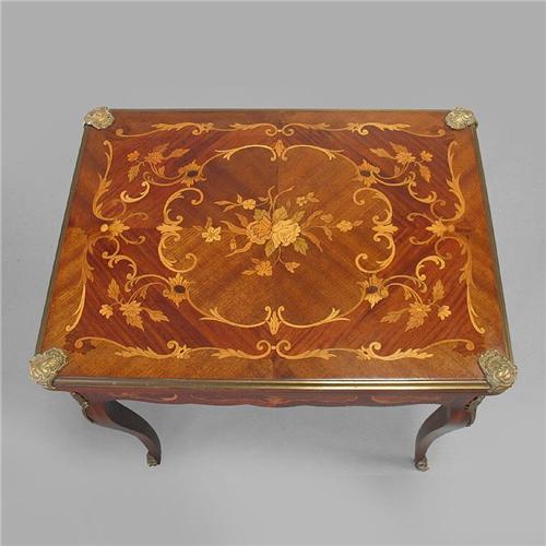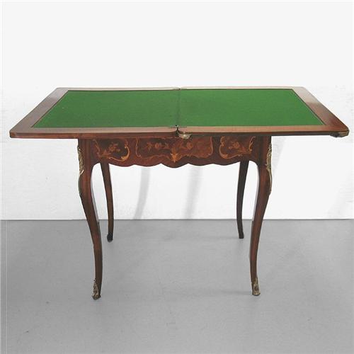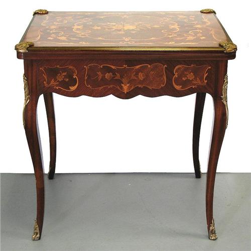 Louis XV style inlaid game table with locking drawer; gilt bronze ormolu; fine tulip wood floral inlay on top and apron; brass molding around top edge with brass corners; opens to felt top; cabriole legs; early 20th C.; closed table measures 30" high x 29" x 23"; open measures 29" high x 45 1/2" x 29"; small holes on green felt; approximately 2" x 2" area of loss on side; small piece of inlay loss on top