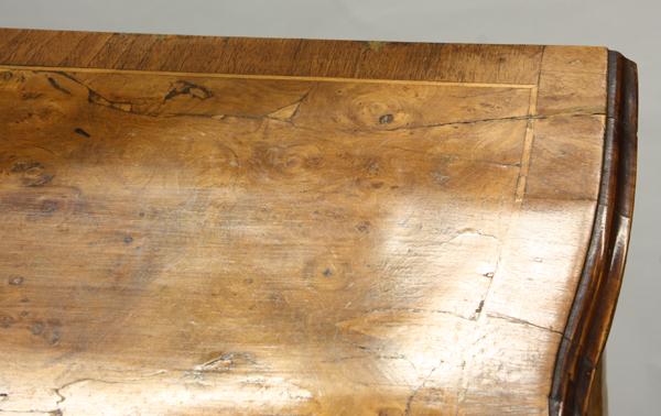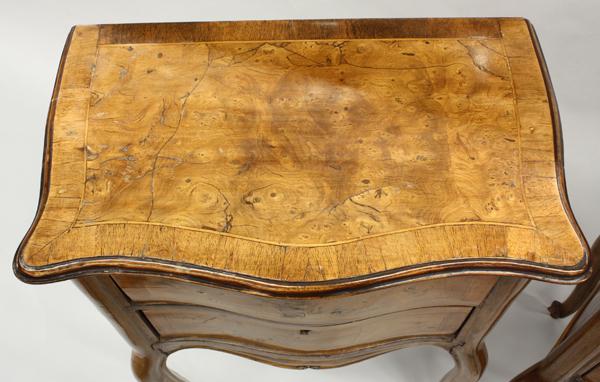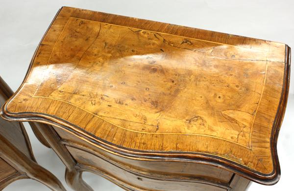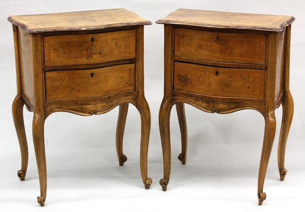 Pair of Louis XV style side cabinets, each having an inlaid serpentine top over a conforming two drawer case and rising on cabriole legs, 28.5''h x 20''w x 12''d