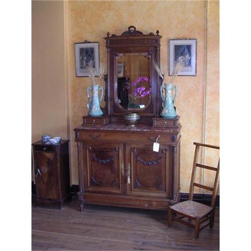 Beautiful Louis XVI coiffeuse/commode in walnut with rust colored marble top and beveled mirror. Wonderful wreath carving on the top and lovely decorative engravings on the drawers. Please feel free to request more detilaed photos. Interior in perfect condition with 3 sliding drawers. In very good condition. Imported from the Nantes region of France