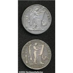 <B>Louis XVI Lot of Two Silver Ecus,</B></I> KM615.8 1793-L Bayonne Mint with bust of Louis, VG; and KM624.1 1793-A Paris Mint with angel writing on tablet, VF, minor rim nick obverse, and scratch in field reverse. 2 coins <BR><BR><B>Important notice:</B> Heritage usually auctions material at the rate of 200-250 lots per hour. On some occasions eBay Live bid software or the Internet may not be able to keep up with the pace of the auction. We recommend placing a realistic absentee bid now as insurance to avoid disappointment. Occasionally the auctioneer may eliminate or reject an eBay Live bid, and the auctioneer may also reopen a lot after the close of the eBay live bidding (usually because we missed an audience bid), and may reject your bid even if it shows you as the winning bidder. By bidding via eBay Live, you agree that Heritage may award the lot to another bidder at its sole discretion under the circumstances described above or any other reasonable circumstances. Since eBay bids are not shown to us until we open the lot on the floor, we treat those bids just like floor bids. In most cases the floor responds before the eBay bid is presented to us, due to Internet lag time, so for consistency we have made it a policy that floor bids are always considered first over tie eBay live bids. Also please note that all Heritage lots purchased through eBay Live carry a 20% Buyer's Premium. Please make sure you read the Terms and Conditions before you bid.