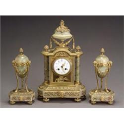 Louis XVI Style Ormolu Mounted Green Onyx Three Piece Clock Garniture