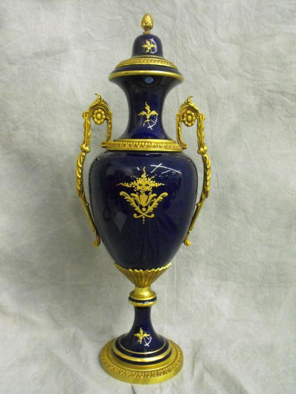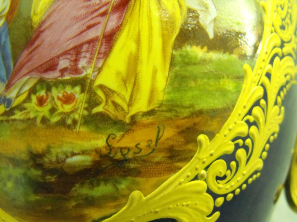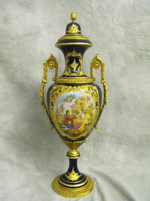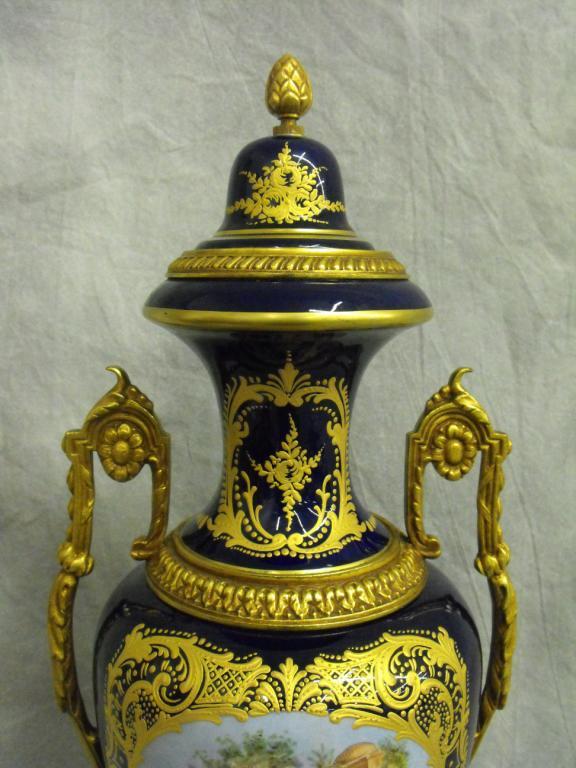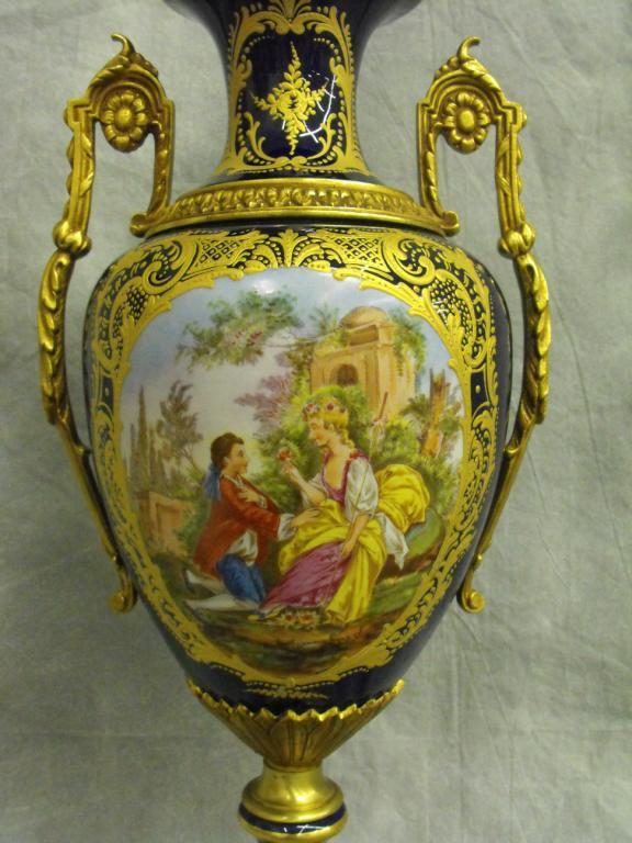 Beautiful Louis VXI style porcelain vase with ornately painted pastoral scene of maiden and suitor, in the blue du roi color and gold painted accents and gilt bronze style handles and base. 25" tall in near new condition.