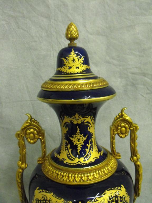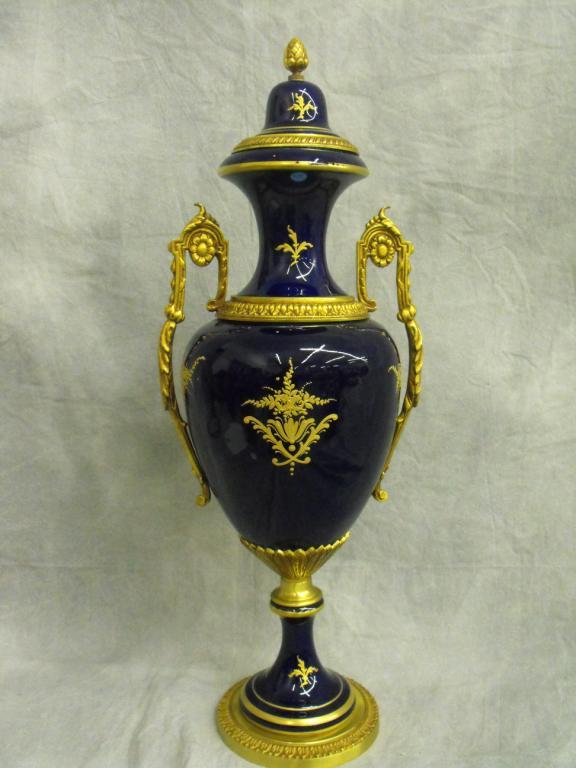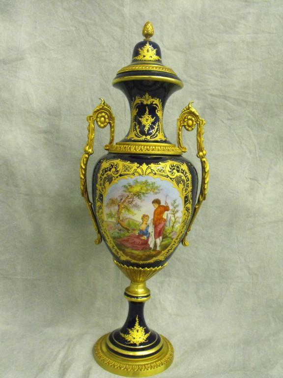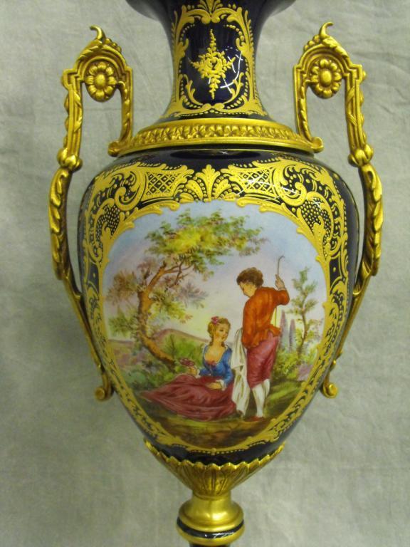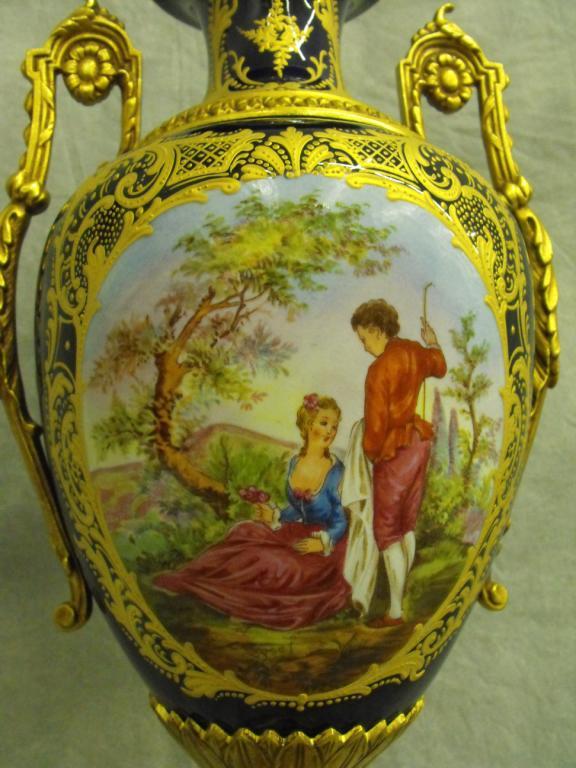 Beautiful Louis VXI style porcelain vase with ornately painted pastoral scene of maiden and suitor, in the blue du roi color and gold painted accents and gilt bronze style handles and base. 25" tall in near new condition.