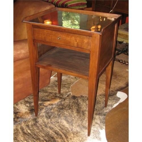 </font></strong>Louis XVI style side table in cherry wood, oak and walnut with an eglomized glass top. Finished all the way around.</font>