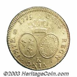 <TABLE cellSpacing=0 cellPadding=0 width="100%" bgColor=#000000 border=0><TBODY> <TR><TD width="100%"><TABLE cellSpacing=1 cellPadding=3 width="100%" border=0><TBODY><TR><TD width="100%" bgColor=#79735c><FONT face=arial color=#ffffff size=3><B>Description</B> </FONT></TD></TR><TR><TD width="100%" bgColor=#ffffff><FONT face=arial size=2><B>Louis XVI gold 2 Louis d'Or 1775K,</B></I> Bust left/Crowned shields, KM575.8, Fr-470, lustrous AU and a very scarce type. </FONT></TD></TR></TBODY></TABLE></TD></TR></TBODY></TABLE><BR><A name=PricesRealized></A><TABLE cellSpacing=0 cellPadding=0 width="100%" bgColor=#000000 border=0><TBODY><TR><TD width="100%"><TABLE cellSpacing=1 cellPadding=3 width="100%" border=0><TBODY><TR><TD width="100%" bgColor=#79735c><A name=PR><FONT face=arial color=#ffffff size=3><B>Previous Prices from Heritage Auctions</B> </FONT></A></TD></TR><TR><TD bgColor=#f6f6ed>No Prior Data Recorded </TD></TR><TR><TD bgColor=#ffffff><FONT face=arial size=1 ?>PLEASE NOTE: All prices realized reflect the final hammer price PLUS the buyer's premium in auctions that charge a buyer's premium. Each item has a notation at the top of the listing indicating whether that lot included a buyer's premium. Example: A item that sells with a final hammer price of $100 and a 20% buyer's premium will display with a price realized of $120. All information listed is intended to be as accurate as possible, but errors are possible. Please use this guide carefully and inform us of any inaccuracies. </FONT></TD></TR></TBODY></TABLE></TD></TR></TBODY></TABLE><BR><TABLE cellSpacing=0 cellPadding=0 width="100%" bgColor=#000000 border=0><TBODY><TR><TD width="100%"><TABLE cellSpacing=1 cellPadding=3 width="100%" border=0><TBODY><TR><TD width="100%" bgColor=#79735c colSpan=6><FONT face=arial color=#ffffff size=3><B>Price Guide*</B> </FONT></TD></TR><TR bgColor=#f6f6ed><TD align=middle><B>Grade</B> </TD><TD align=middle><B>Coin World<BR>(Trends)</B> </TD><TD align=middle><B>Numismedia<BR>Retail</B> </TD><TD align=middle><B>Numismedia<BR>Wholesale</B> </TD><TD align=middle><B>Coin<BR>Universe</B> </TD><TD align=middle><B>Heritage<BR>Value Index</B> </TD></TR><TR bgColor=#ffffff><TD colSpan=6><FONT size=1>*All information listed is intended to be as accurate as possible, but errors are possible. No item may be returned or refused based on this information which is provided as a service to our customers. You should contact each pricing source directly to determine the accuracy of this information. </FONT></TD></TR></TBODY></TABLE></TD></TR></TBODY></TABLE><BR><TABLE cellSpacing=0 cellPadding=0 width="100%" bgColor=#000000 border=0><TBODY><TR><TD width="100%"><TABLE cellSpacing=1 cellPadding=3 width="100%" border=0><TBODY><TR><TD width="100%" bgColor=#79735c><FONT face=arial color=#ffffff size=3><B>Population Guide</B> </FONT></TD></TR><TR bgColor=#ffffff> Important notice: Heritage usually auctions material at the rate of 200-250 lots per hour. On some occasions eBay Live bid software or the Internet may not be able to keep up with the pace of the auction. We recommend placing a realistic absentee bid now as insurance to avoid disappointment. Occasionally the auctioneer may eliminate or reject an eBay Live bid, and the auctioneer may also reopen a lot after the close of the eBay live bidding (usually because we missed an audience bid), and may reject your bid even if it shows you as the winning bidder. By bidding via eBay Live, you agree that Heritage may award the lot to another bidder at its sole discretion under the circumstances described above or any other reasonable circumstances. Also please note that all Heritage lots purchased through eBay Live carry a 20% Buyer's Premium. Please make sure you read the Terms and Conditions before you bid.</TD></TR></TBODY></TABLE></TD></TR></TBODY></TABLE>