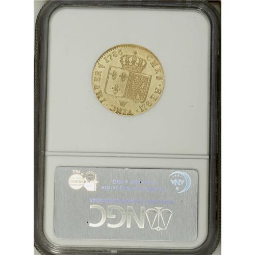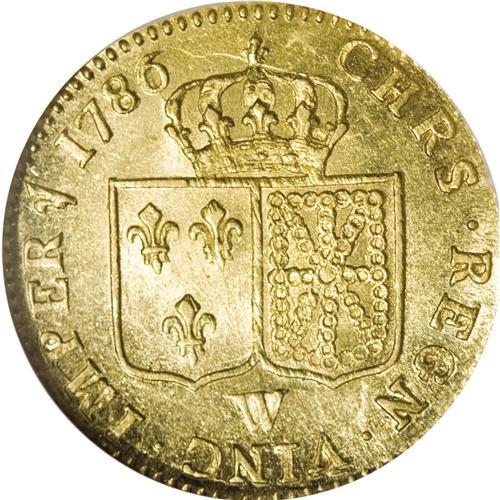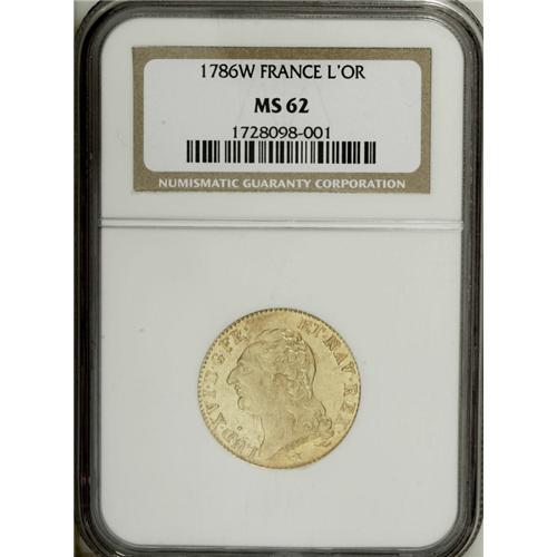 <B>Louis XVI gold Louis d'Or 1786W, </B></I>KM591.15, MS62 NGC, a nice fully lustrous example struck in the second semester of 1786 with the dot below the L in LUD...<BR><BR><b>Shipping:</b> Coin/Currency (<a target="_blank" href="http://www.heritageauctions.com/common/shipping.php">view shipping information</a>)