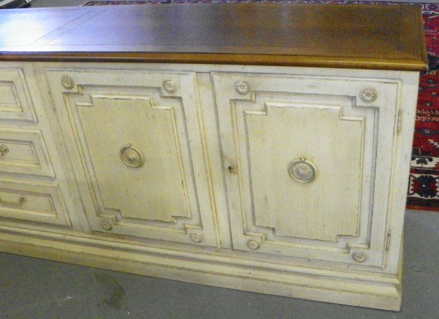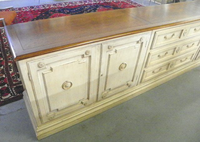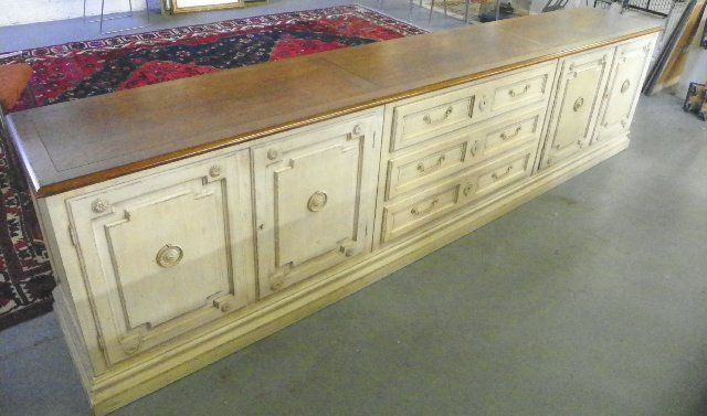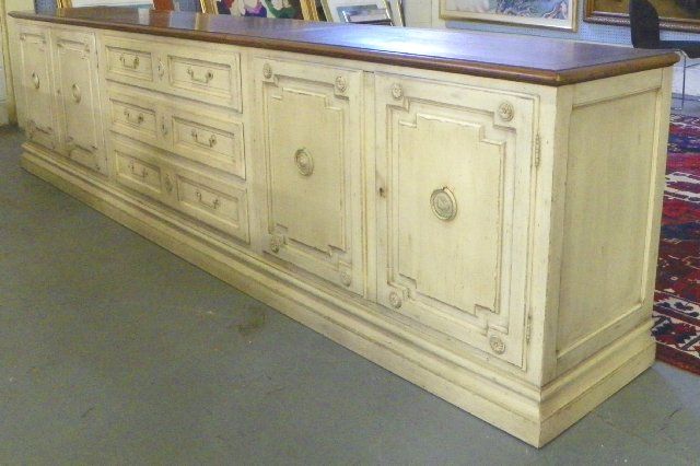 Walnut top, distressed white finish, 3 central drawers with 2 doors on either sides, comes apart. Approx. 102" W x 30" H x 19" D. Please read our terms of sale.