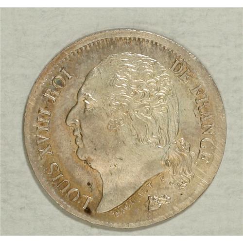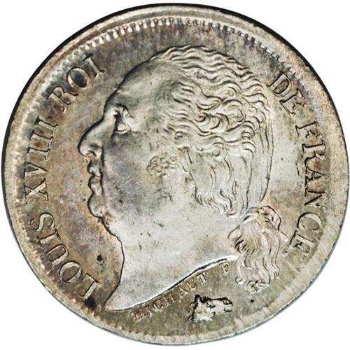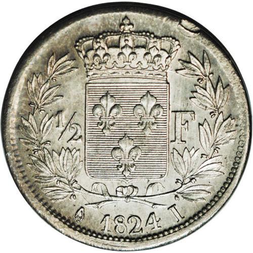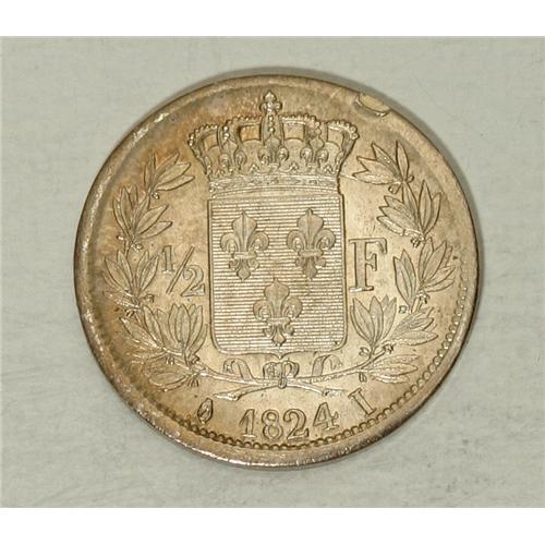 <B>Louis XVIII 1/2 Franc 1824I, </B></I>KM708.5, choice brilliant UNC with soft golden toning and semi-prooflike surfaces. Scarcer Mint.<BR><I>From the Shinholser Collection</B></I><BR><BR><b>Shipping:</b> Coin/Currency (<a target="_blank" href="http://www.heritageauctions.com/common/shipping.php">view shipping information</a>)