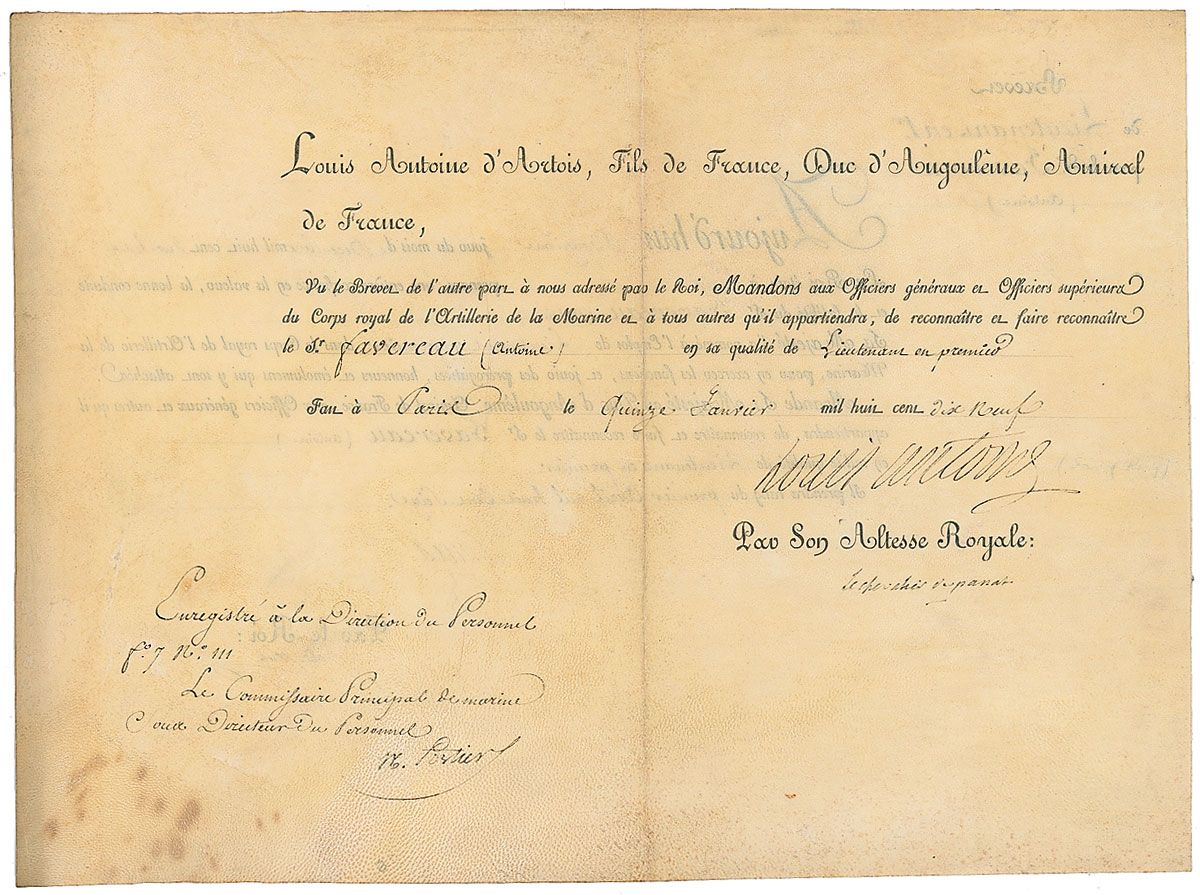 Louis-Mathieu Mole (1781–1855) was a French statesman and 18th Prime Minister of France. Partly-printed vellum DS, in French, signed “Cte. Mole,” one page both sides, 14.25 x 10.5, December 12, 1818. Louis XVIII appoints the Duc d’Angoulme, Louis Antoine de Bourbon, as an admiral. Signed at the conclusion by Mole, and signed by a secretary on the behalf of the king. Reverse is signed by Louis Antoine to confirm the appointment. A central vertical fold and light scattered soiling, otherwise fine condition.