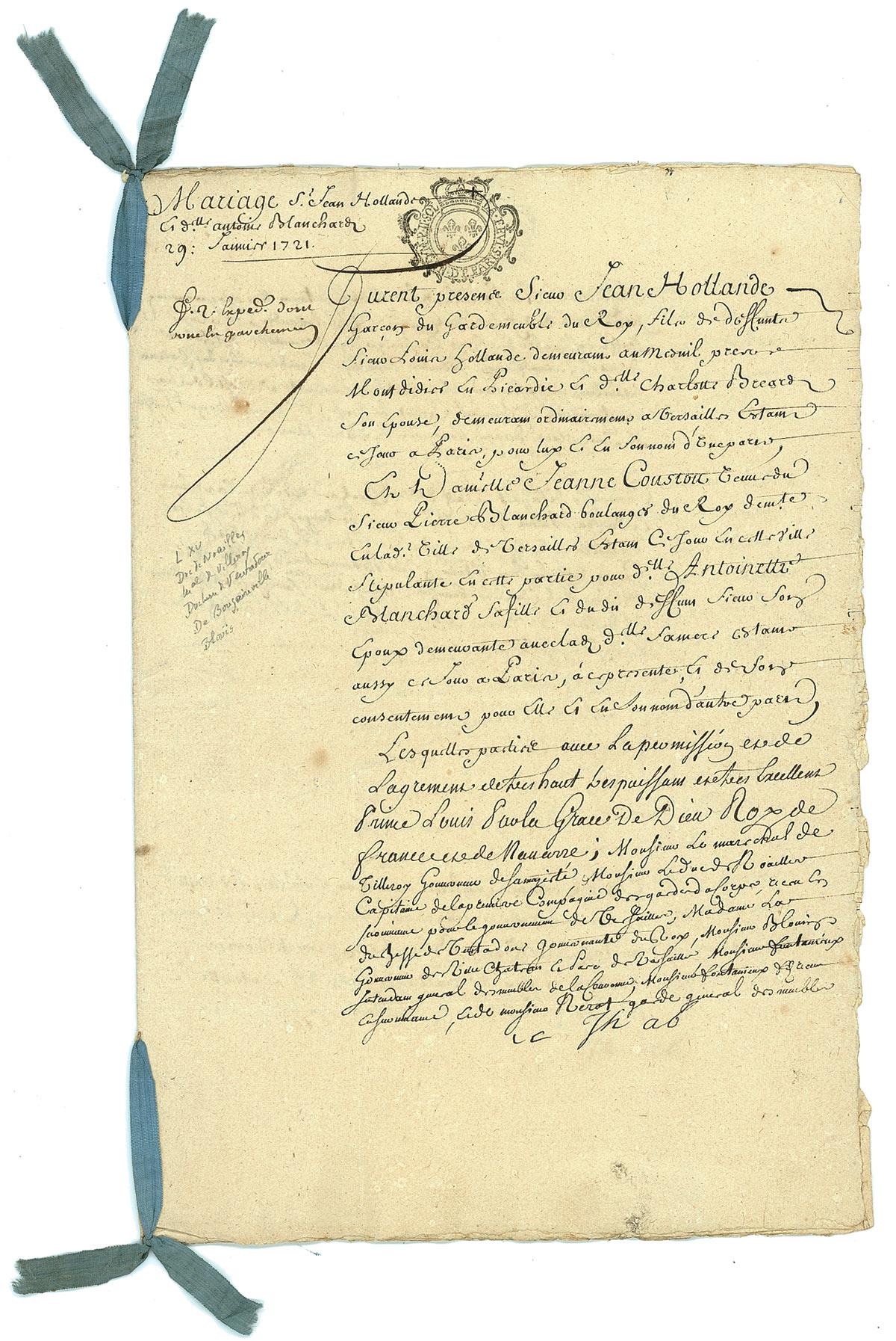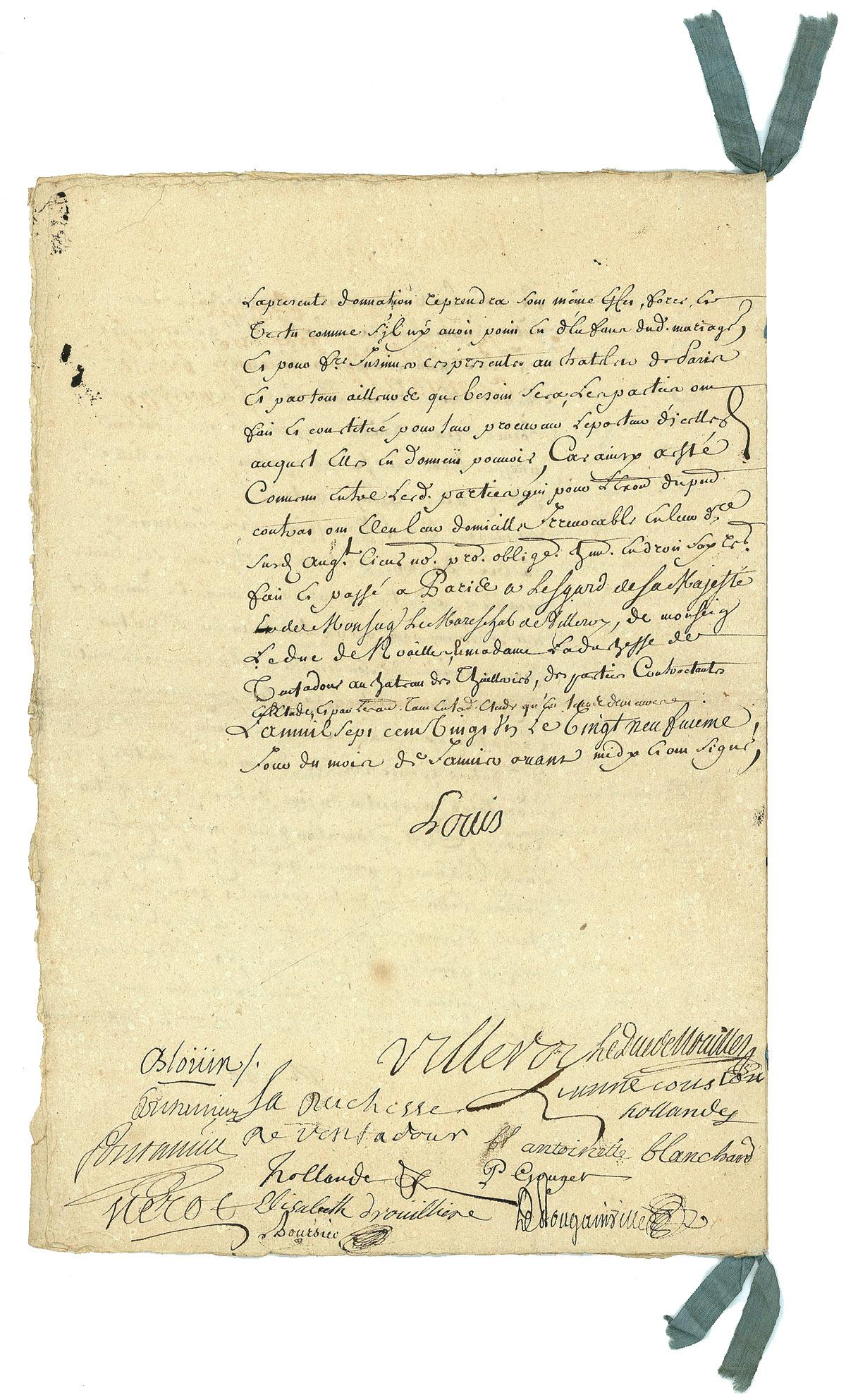 Ineffectual king of France from 1715 to 1774 who was dominated by his strong-willed and unscrupulous mistress, Madame de Pompadour. Advised of the growing discontent among his people, Louis prophetically observed “Après moi le déluge”—After me the flood—an apt prediction of the impending French Revolution. DS, in French, signed “Louis,” eleven pages on six sheets, 9 x 13.25, January 29, 1721. Rare marriage contract signed by the king and some 25 nobles and officials. Marriage contract for Jean Hollande, member of the King’s Guard, and Antoinette Blanchard. Among the signataries are the Duke of Villeroi, governor of Louis XV and the King’s life-long friend; the Duchess of Ventadour, the King’s governess until 1717; the Duke of Noailles, Marshal of France, Pierre-Yves de Bougainville, notary and member of the King’s Council, father of the explorer Louis-Antoine de Bougainville, has signed twice at the end. A couple small pencil notations, and some scattered light soiling and ink marks, otherwise fine condition. Pre-certified John Reznikoff/PSA/DNA and RRAuction COA.