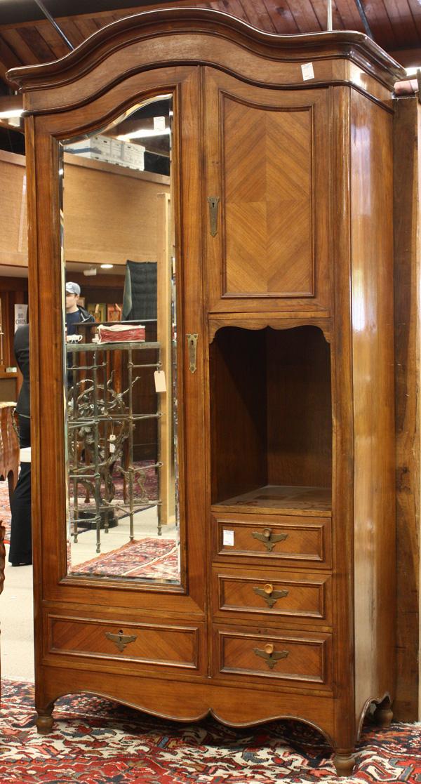Louis XVl style walnut armoire, circa 1900, labeled on the interior door ''Meubles de Style, Wolf & Glates, Basel'', the domed cornice with a half bullnose edge, below the armoire is divided into two sections, on the left side a single bevelled mirrored door above a single drawer, on the right side a cupboard door, within a single shelf dividing the storage space, below an open storage area, underneath are three drawers all with hand dovetail construction, all the drawers and cupboards have brass escutcheons, and parquetry veneer, below a scalloped apron, and the whole raised on turned feet, 88''h x 45''w x 23''d