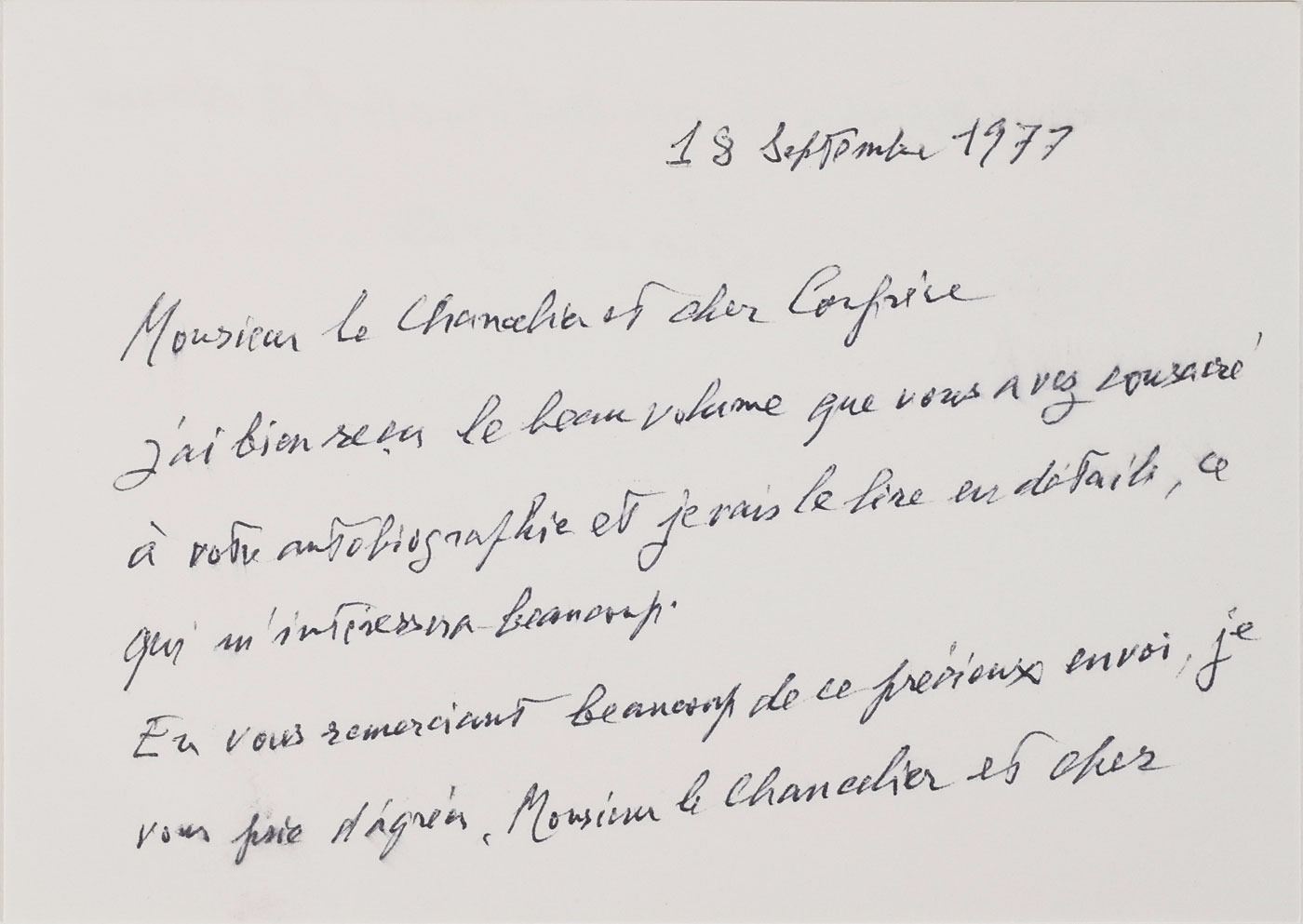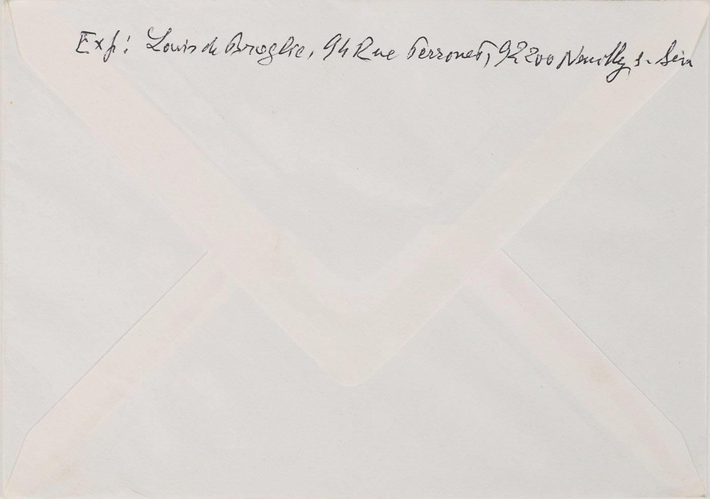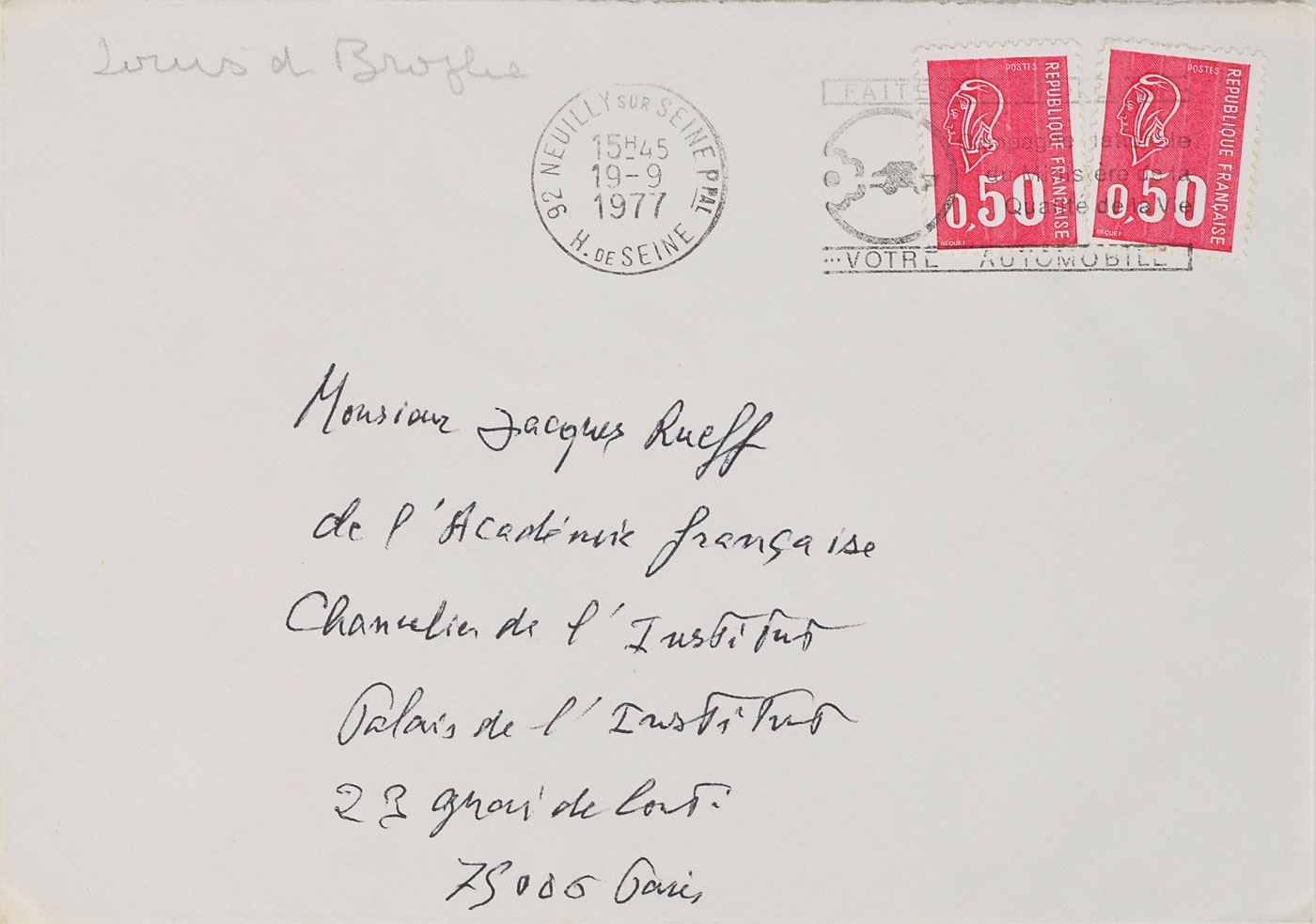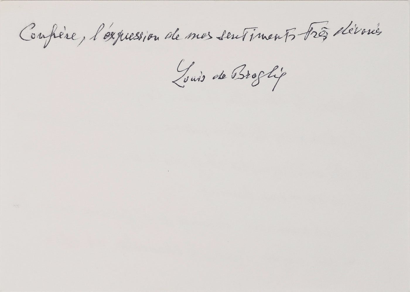 French physicist (1892–1987) known for his theory that matter has the properties of both particles and waves, who was awarded the 1929 Nobel Prize in Physics. ALS in French, one page both sides, 6 x 4.25, September 18, 1977. Untranslated letter to French economist Jacques Rueff, a member of the Academie francaise. In fine condition. Accompanied by the original mailing envelope addressed in Broglie's hand, incorporating his full name in the return address on the flap.