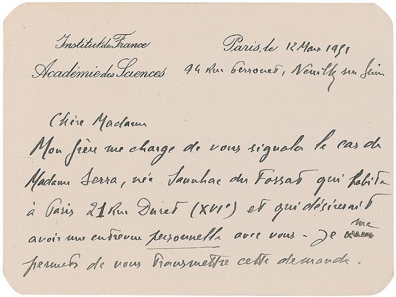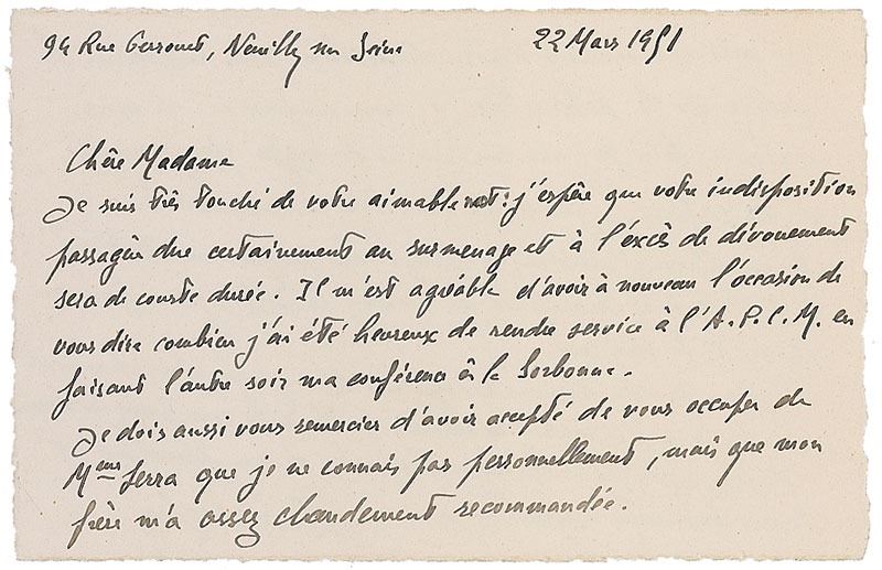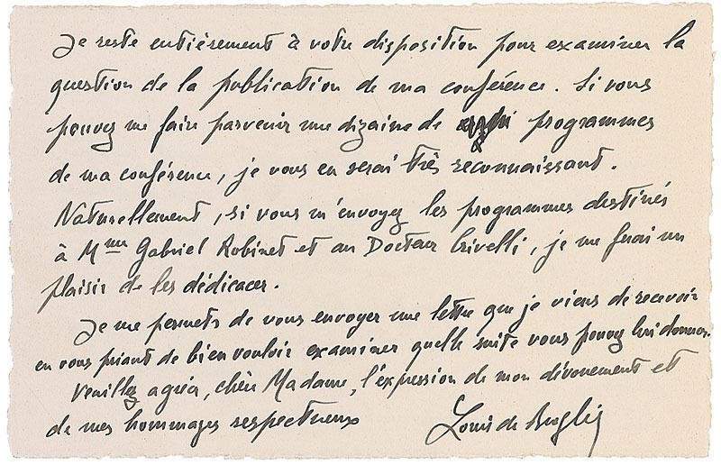 French physicist (1892–1987) known for his theory that matter has the properties of both particles and waves, who was awarded the 1929 Nobel Prize in Physics. Two ALSs, in French, both one page, both sides, 6 x 4 and 4.75 x 3.5, dated March 12 and 22, 1951, respectively both to Henriette Craponne-Eudel, General Secretary of "Assistance Privée a la Classe Moyenne [Private Help for the Middle Class]." Both letters refer to his lecture on Atomic Energy at the Sorbonne. One reads, in part (translated): "I had much pleasure in being of service to the A.P.C.M by delivering my lecture on Atomic Energy...Madame Fieves writes me about the possibility of publishing my lecture. I've already promised the text to Mr. Chouneix of the Revue des deux mondes but that needn't prevent the making of a Special edition if you think it useful...l'm entirely at your service...for the publication of my lecture...Can you have a dozen programs sent to me...I'll be glad to autograph programs for Mrs. Gabriel Robinet and Dr. Crivelli." In overall fine condition.