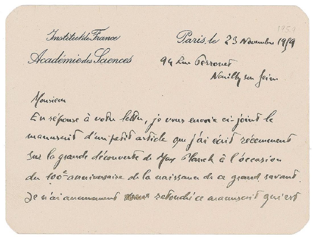 French physicist (1892–1987) known for his theory that matter has the properties of both particles and waves, who was awarded the 1929 Nobel Prize in Physics. ALS in French, one page both sides, 4.75 x 3.5, Institut de France letterhead, November 23, 1959. Untranslated letter mentioning the 100th anniversary of the birth of Max Planck