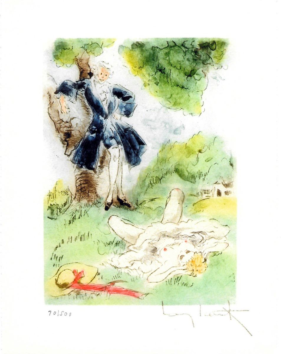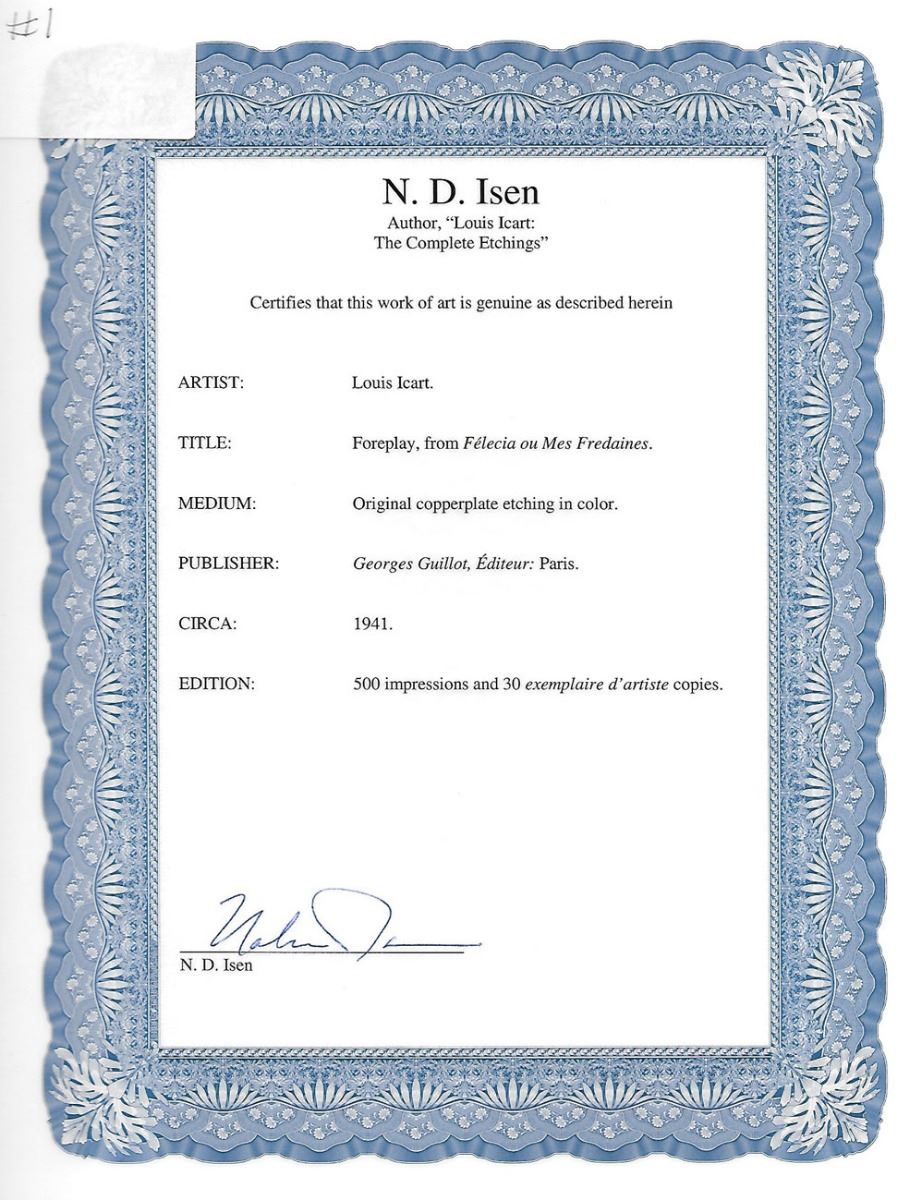 Louis icart etching copper plate titled "foreplay" from the illustrated book "felecia ou mes fredaines" circa 1941 with certificate. 8X10.5 inches.