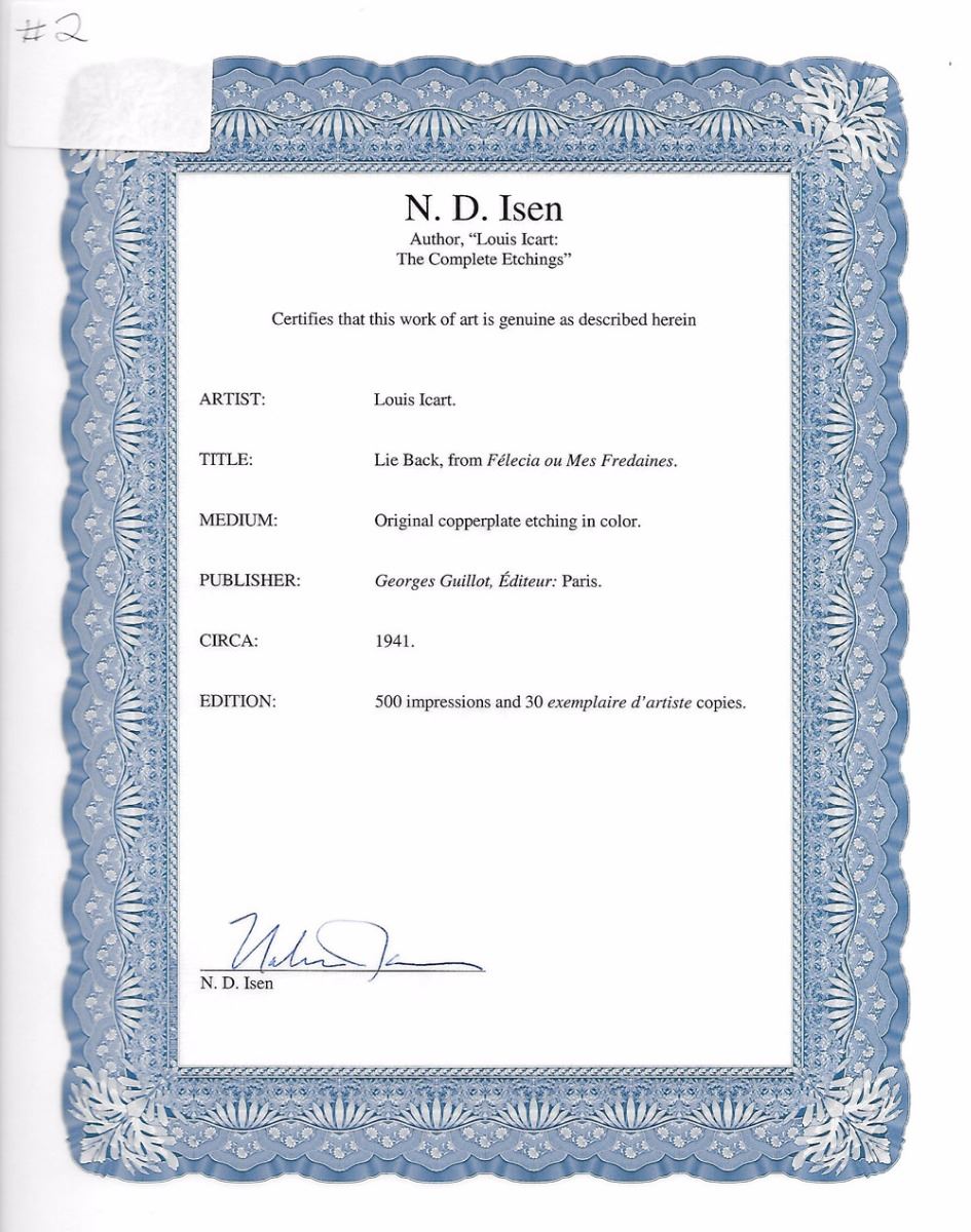 Louis icart etching copper plate titled "lie back" from the illustrated book "felecia ou mes fredaines" circa 1941 with certificate. 8X10.5 inches.