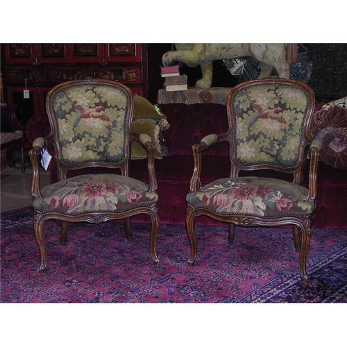 Louis XV Fauteuil with cartouche shaped padded back and upholstered seat in moulded frame with flower head crestings on cabriole legs. The chairs are made of walnut and have their original tapestry. The chairs are sold as a pair.