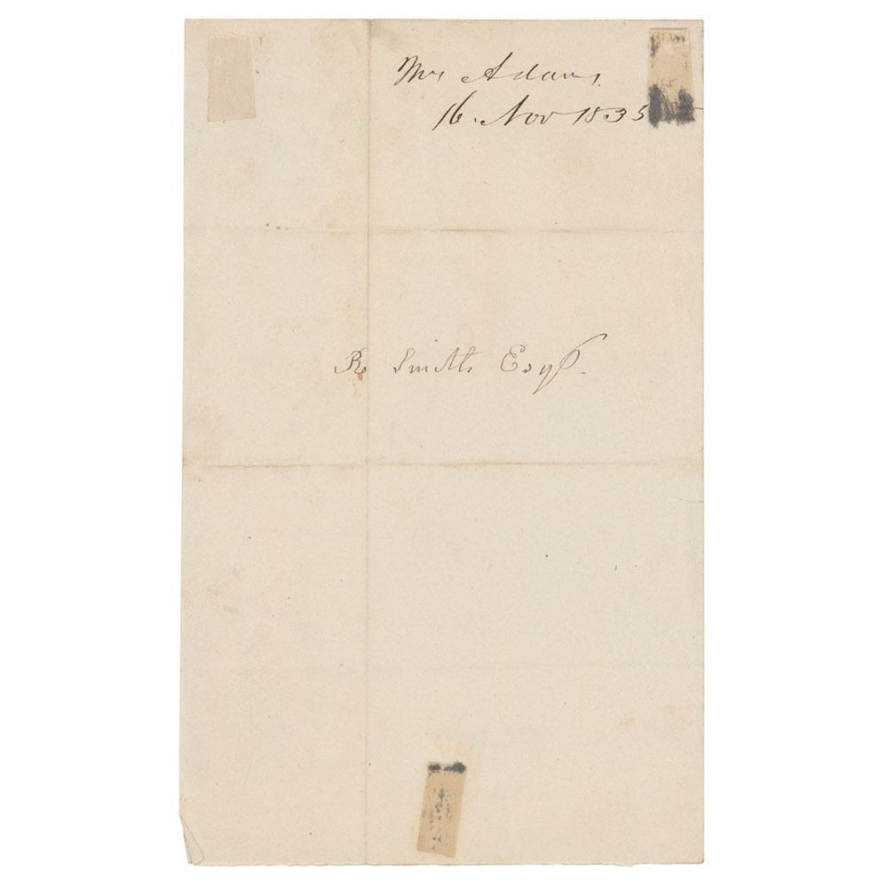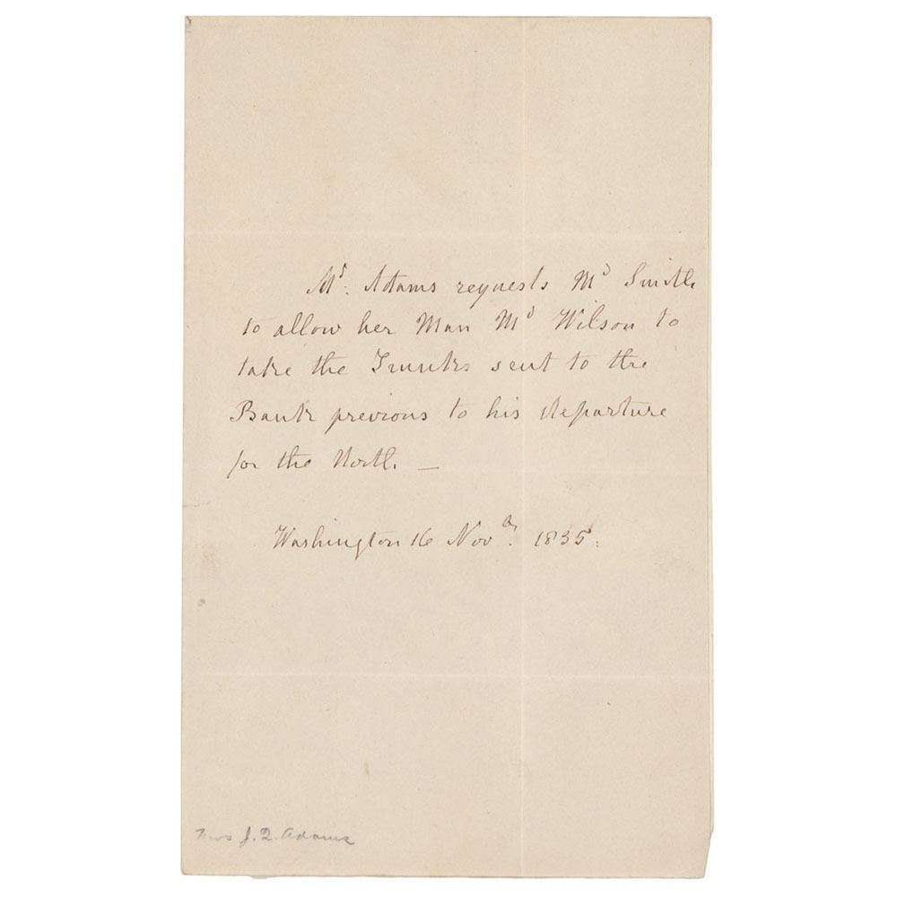 Scarce third-person ALS, one page, 4.75 x 8, November 16, 1835. Handwritten letter to "R. Smith," in full: "Mrs. Adams requests Mr. Smith to allow her man Mr. Wilson to take the Trunks sent to the Bank previous to his departure for the North." Addressed on the integral leaf in Adams's hand. In fine condition, with small mounting remnants to address leaf.