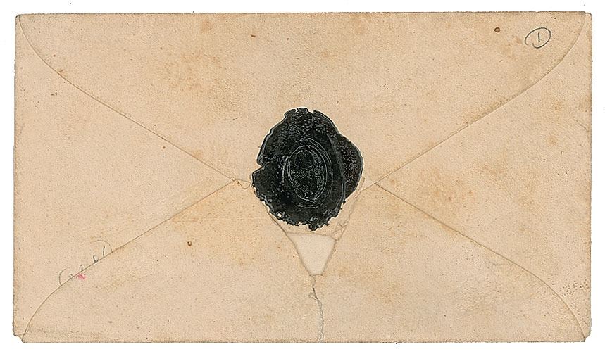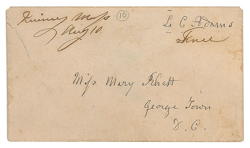 Hand-addressed and free-franked mailing envelope, 4.25 x 2.5, addressed by Adams to "Miss Mary Rhett, George Town, D. C.," and franked in the upper right, "L. C. Adams." Marked in another hand, "Quincy, Mass, Aug. 10" and "Free." In very good to fine condition, with a tear to the upper left corner.