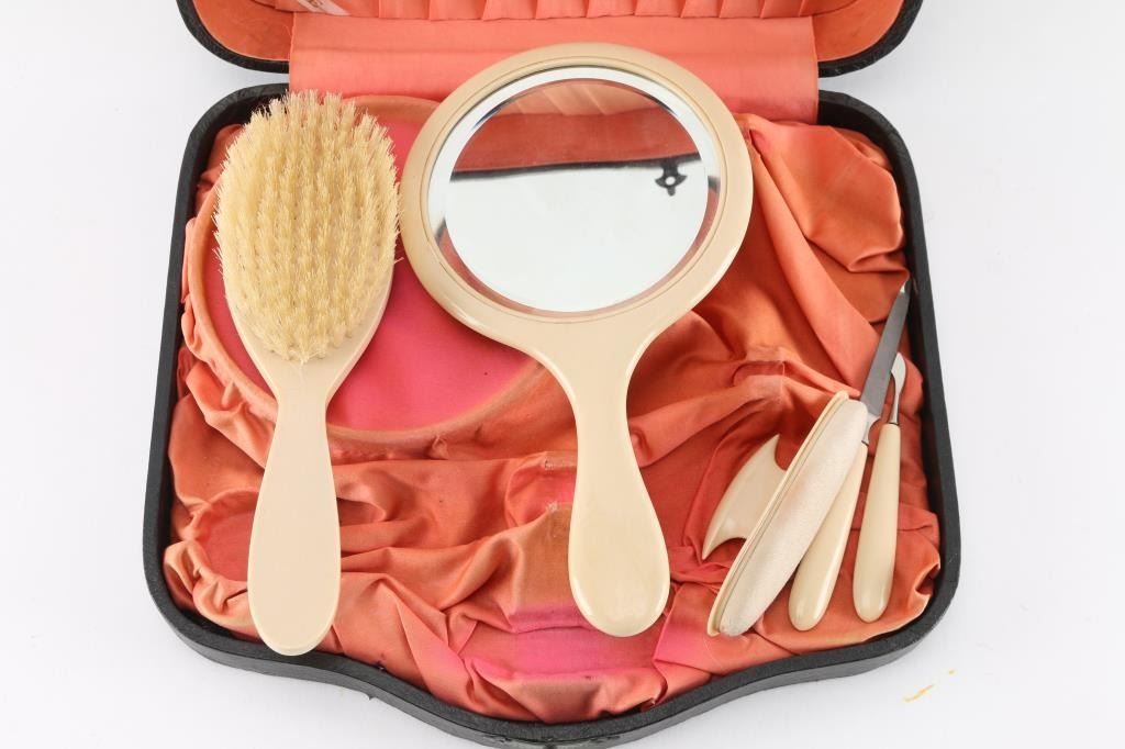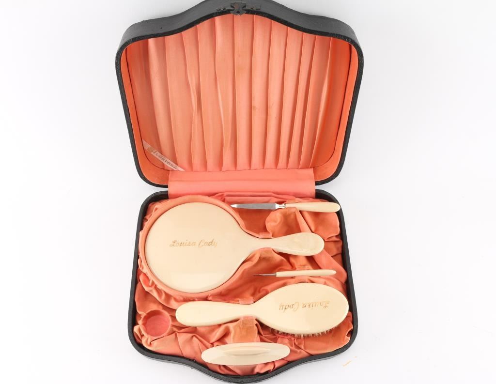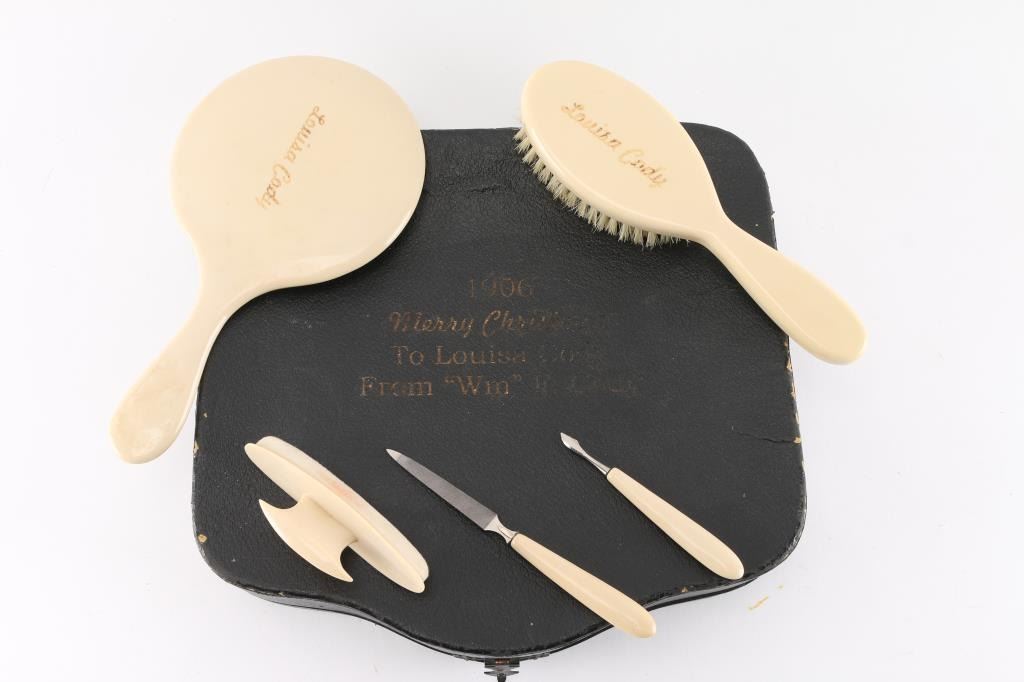 In presentation case from William F. Cody. Includes engraved mirror, brush, nail file buffer, and nail pick in a black leather case lined with peach satin. (One empty space for small round container.) Top of case inscribed "1906 Merry Christmas to Louisa Cody from Wm F. Cody".