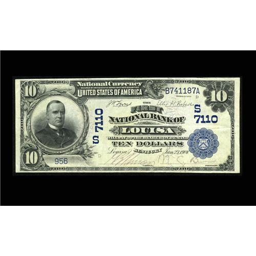 <B>Louisa, KY</B></I> - $10 1902 Date Back Fr. 616 <B>The First NB</B></I> Ch. # (S)7110<BR>An attractive piece which is one of the nicest notes reported from here. Bright <B>Extremely Fine,</B></I> with a miniscule margin split barely worthy of mention.