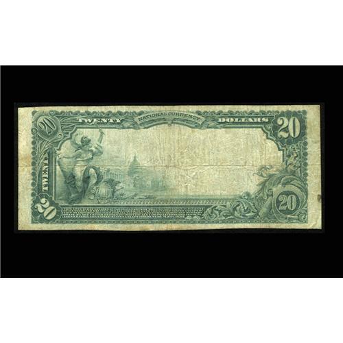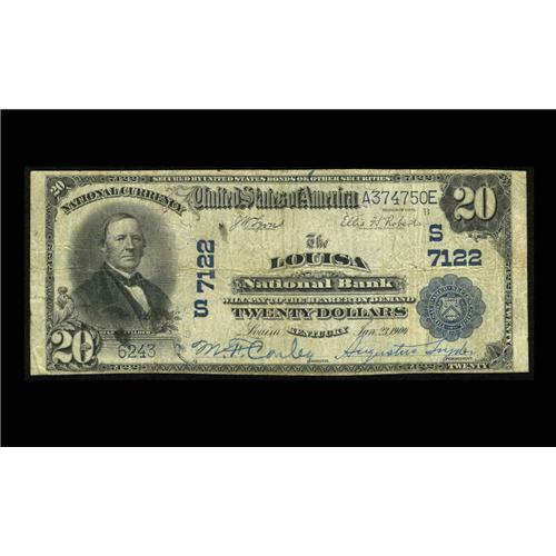 <B>Louisa, KY</B></I> - $20 1902 Plain Back Fr. 650 <B>The Louisa NB</B></I> Ch. # (S)7122<BR>A second example from this Louisa bank as well, with this note grading a decent <B>Fine</B></I> and displaying blue pen signatures of M.F. Conley and Augustus Snyder.