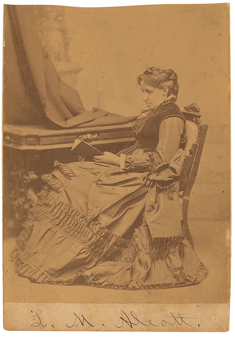 Original 4 x 5.75 cabinet photo by Warren of Boston of Alcott seated and reading a book, signed in the lower border in black ink, “L. M. Alcott.” In very good condition, with irregularly trimmed edges and overall foxing; the image and signature remain sharp and bold. This is the first Alcott signed photo we have ever offered.