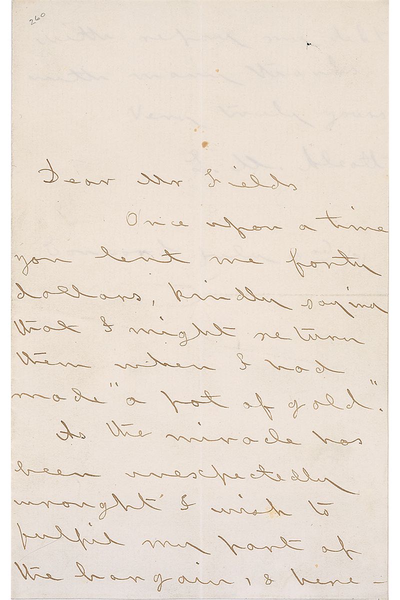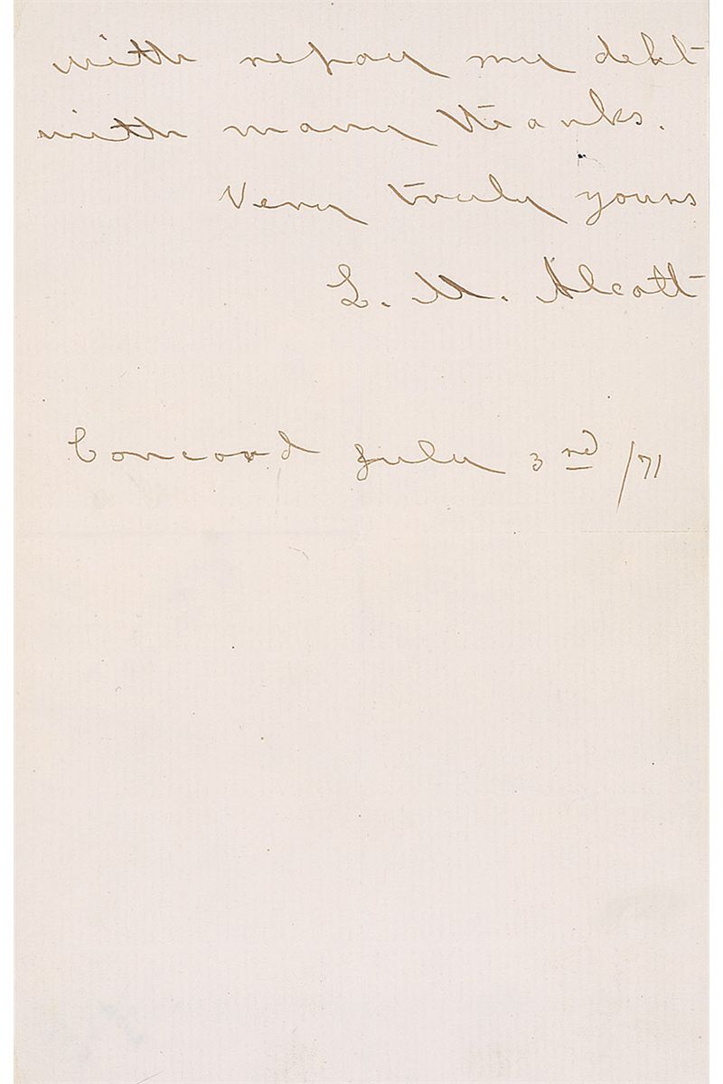Choice ALS signed “L. M. Alcott,” two pages on two adjoining sheets, 4.75 x 7.5, July 3, 1871. Letter to publisher James Thomas Fields. In full: “Once upon a time you lent me forty dollars, kindly saying that I might return them when I had made ‘a pot of gold.’ As the miracle has been unexpectedly wrought, I wish to fulfill my part of the bargain, & herewith repay my debt with many thanks.” In fine condition, with central vertical and horizontal folds (one vertical fold passing through first letter of the signature). Due to her father’s chronic unemployment, Alcott grew up in poverty and her family incurred numerous debts—she saw her career as a writer as an economic necessity, driven by a feeling of duty to her family to provide economic security. Alcott had published Little Men earlier in 1871, and by June had sold over 50,000 copies—this tremendous success earned her the “pot of gold” and provided her with the ability to pay back her debt. In addition to its exquisite content, Alcott letters are very rare—this being just the third we have offered.