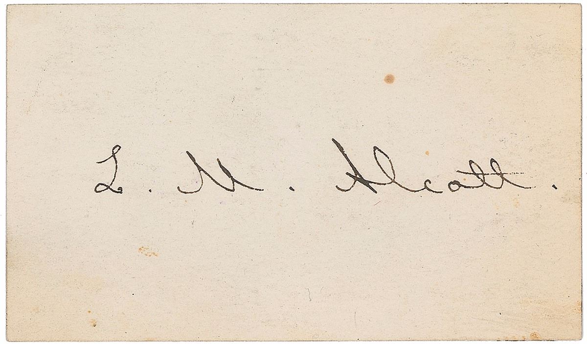 Ink signature, “L. M. Alcott,” on an off-white 3.25 x 1.75 card. In fine condition, with trivial soiling, and toned adhesive remnants to reverse. Accompanied by an unsigned satin-finish photo of Alcott.