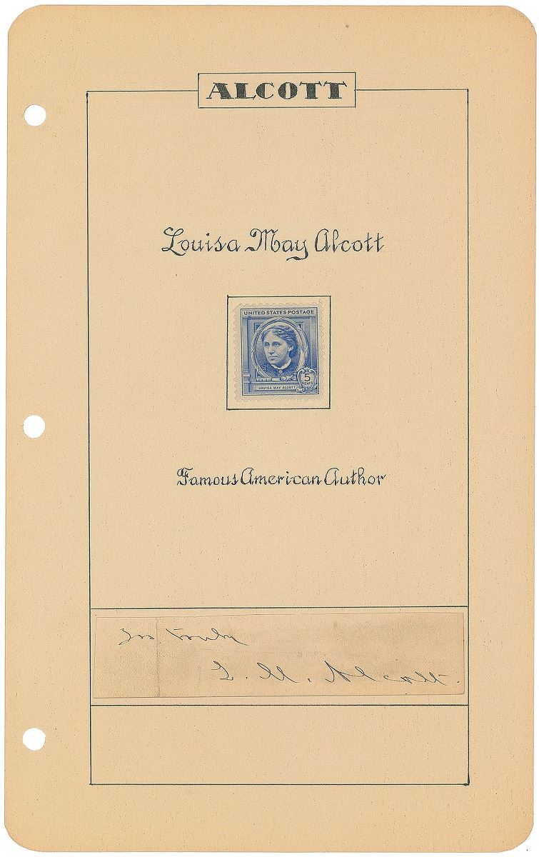 Attractive ink signature, “Yrs. truly, L. M. Alcott,” on an off-white slip affixed to an appealing 6 x 9.5 album page hand-embellished with a calligraphic title and postage stamp honoring the noted authoress. In fine condition, with a vertical crease to left side. From the Francis Greeley collection.