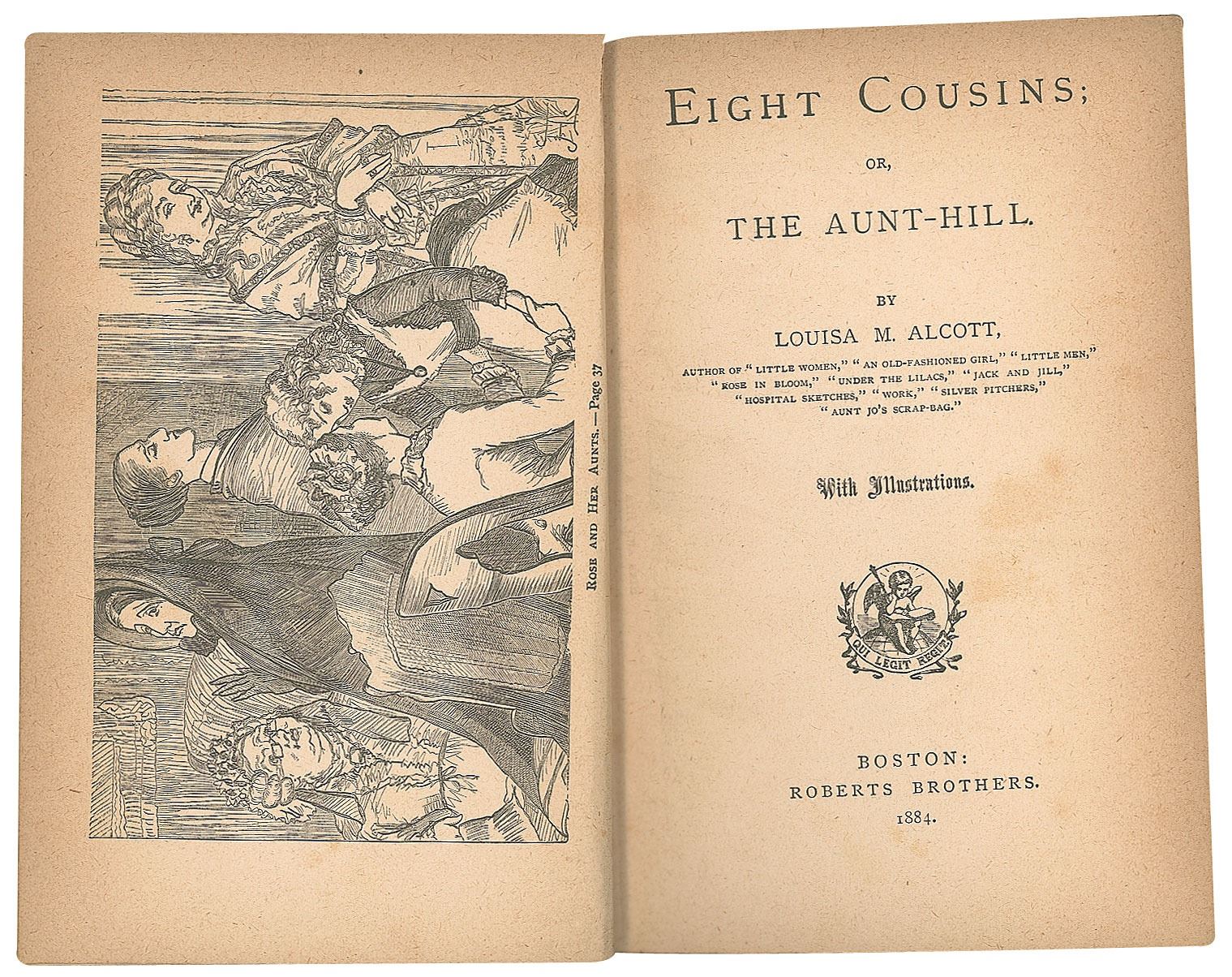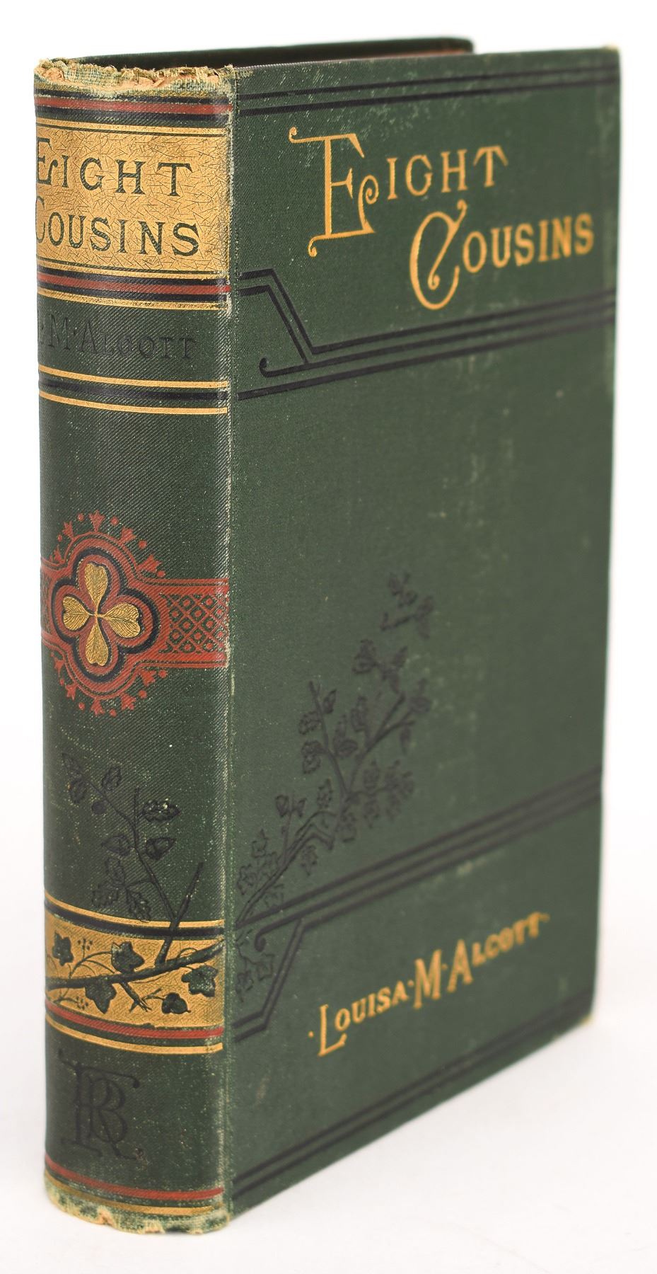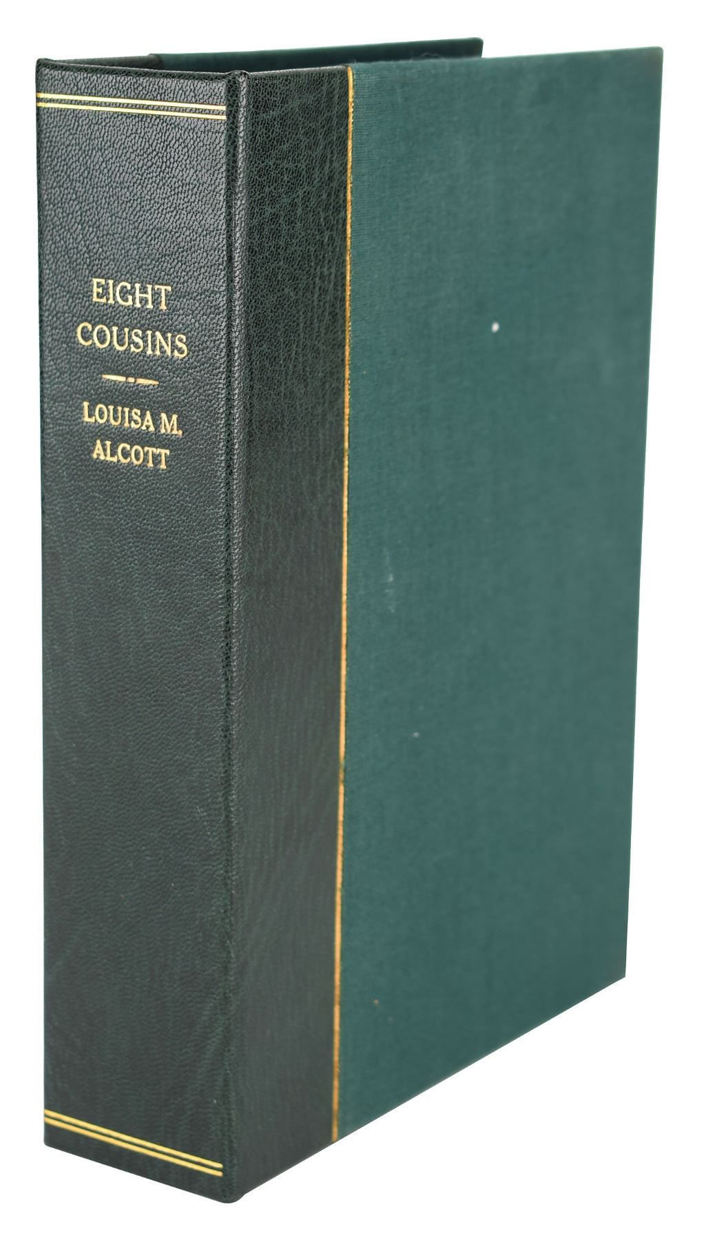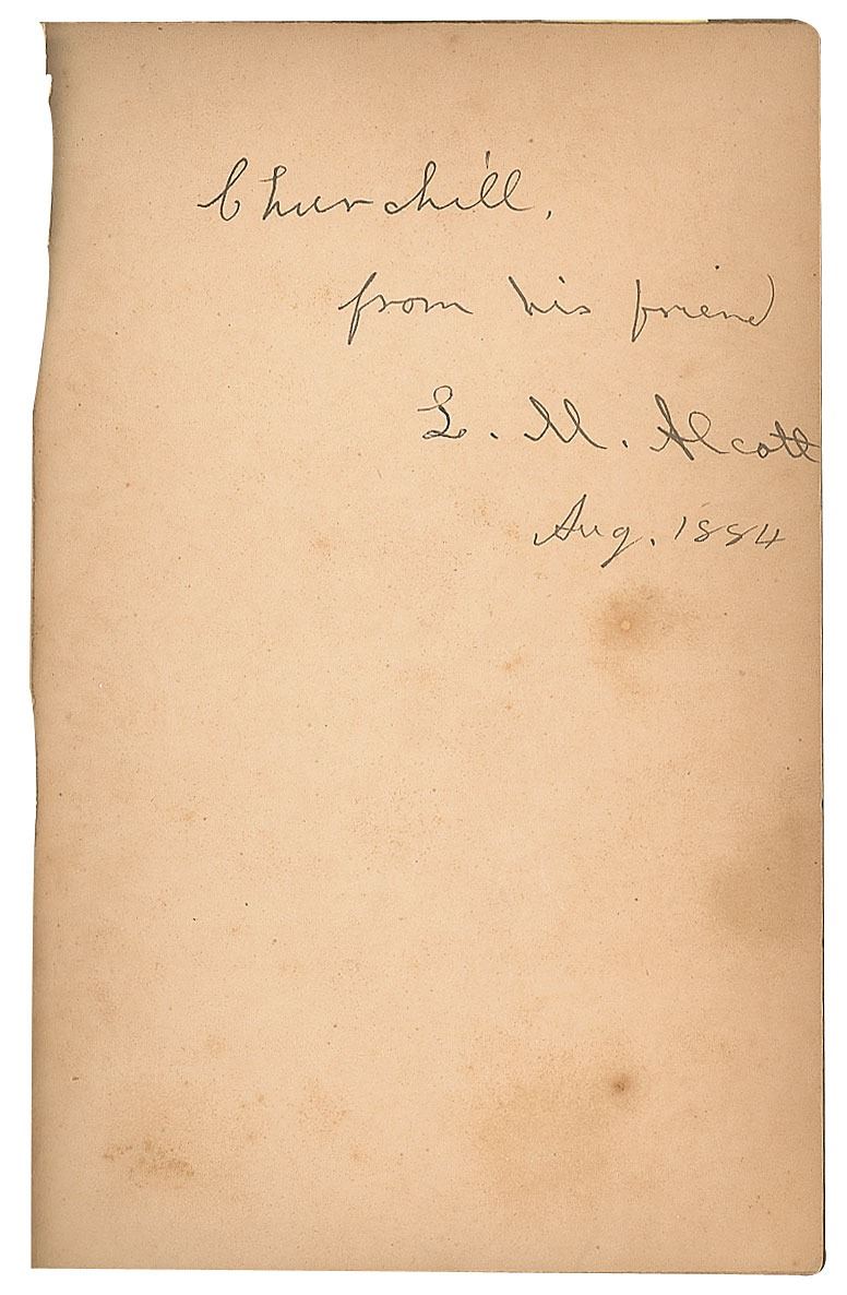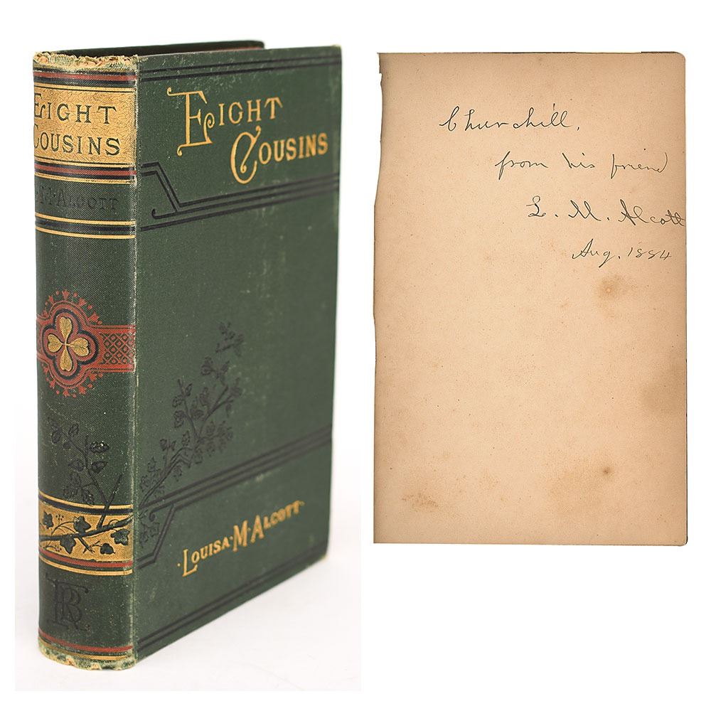 Signed book: Eight Cousins. Later printing. Boston: Roberts Brothers, 1884. Hardcover, 5 x 7, 291 pages. Signed and inscribed on a free end page, "Churchill, from his friend, L. M. Alcott, Aug. 1884." Autographic condition: very good to fine, with toning and foxing to the signed page. Book condition: VG/None, with light edgewear and mild fraying at spine ends. Accompanied by a custom-made clamshell box.
