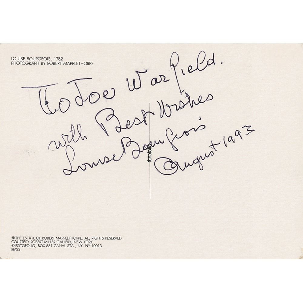 French-American artist (1911–2010) best known for her large-scale sculpture and installation art, which touched on themes including domesticity and the family, sexuality and the body, and death and the unconscious. Uncommon 4.25 x 6 postcard of Robert Mapplethorpe's 1982 portrait of Bourgeois, signed on the reverse in black ballpoint, "To Joe Warfield, with Best Wishes, Louise Bourgeois, August 1993." In fine condition.