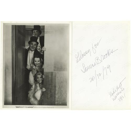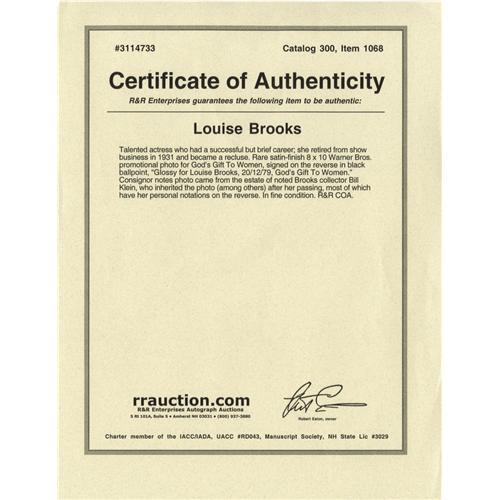 <B>Louise Brooks Signed Photo.</B></I> A rare satin-finish b&w 8" x 10" promo photo for the 1931 romantic comedy <I>God's Gift to Women,</B></I> inscribed "Glossy for Louise Brooks, 20/12/79, God's Gift to Women" by her on the reverse in black ink. The photo is from the estate of noted Brooks collector Bill Klein, who inherited many photos after her passing, most of which feature similar personal notations by Brooks. In Very Fine condition. <I>Accompanied by a certificate of authenticity.</B></I><I>Accompanied by LOA from PSA/DNA.</B></I><BR><BR><b>Shipping:</b> Small Flat (<a target="_blank" href="http://www.heritageauctions.com/common/shipping.php">view shipping information</a>) <BR><BR><B>Important notic