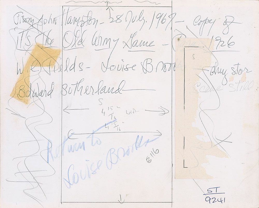 Glossy 10 x 8 photo of Brooks and W. C. Fields in It’s the Old Army Game, signed on the reverse in blue pencil, “Return to Louise Brooks.” Brooks has also made notations on the reverse, “28 July 1967, Copy of It’s the Old Army Game—Para—1926, W. C. Fields—Louise Brooks.” In very good condition, with cropping notations, some mild toning, and mounting remnants to reverse.