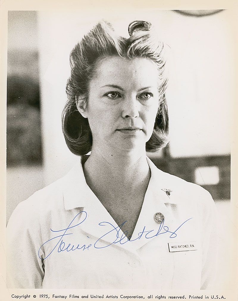 Glossy 8 x 10 photo of Fletcher in character as Nurse Ratched in One Flew Over the Cuckoo's Nest, signed in blue ballpoint. Scattered creases and surface marks, otherwise fine condition.