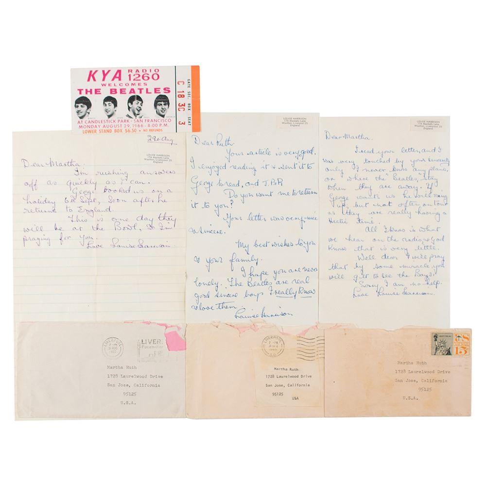 Collection of three ALSs from George Harrison’s older sister, Louise. Each handwritten letter is one page in length and addressed to Beatles fan Martha Ruth in January and August of 1965. Included with the letters is a 4.75 x 2.5 ticket stub for the Beatles concert at Candlestick Park in San Francisco on August 29, 1966, for the "Lower Stand Box, Gate C, Sec. 18, Box 3C, Seat 3." This was the band’s very last scheduled live concert, though they would appear unannounced for their famed ‘rooftop’ show in 1969.