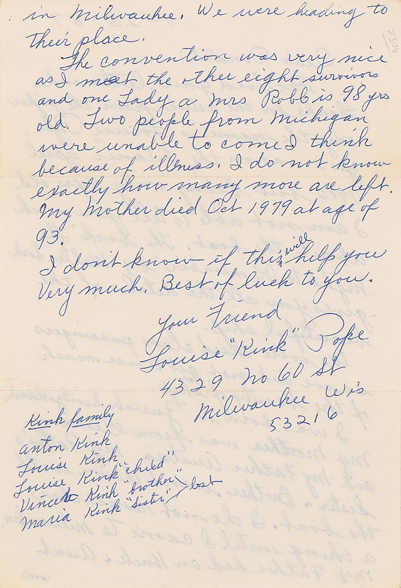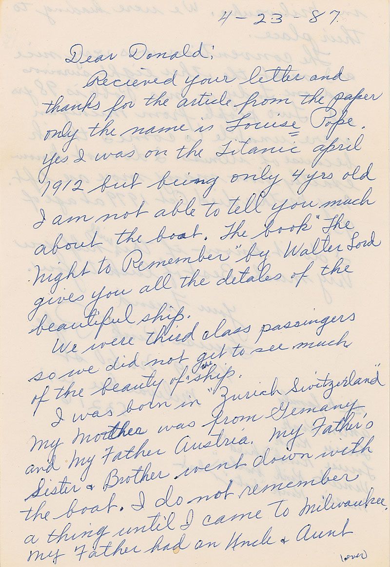 Third class passenger aboard the Titanic (1908-1992), only 4-years-old at the time, who survived along with her parents, but lost her aunt and uncle in the tragedy. ALS, one page both sides, 6 x 8.75, April 23, 1987. In part: “Yes I was on the Titanic April 1912 but being only 4 years old I am not able to tell you much about the boat…We were third class passengers so we did not get to see much of the beauty of the ship…The convention was very nice and I met the other eight survivors and one Lady a Mrs. Robb is 98 years old. Two people from Michigan were unable to come I think because of illness. I do not know exactly how many more are left.” In fine condition. Accompanied by the original mailing envelope. Ex. Brian Green Collection.