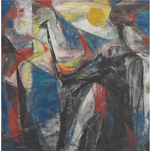 Louise Woodroofe (American, early 20th century), Abstract Composition, c.1950;25in. x 25in., signed.Woodroofe worked in Champaign, iL, and later taught at the University of Illinois.During the 1930s she traveled with the Ringling Brothers Circus, painting