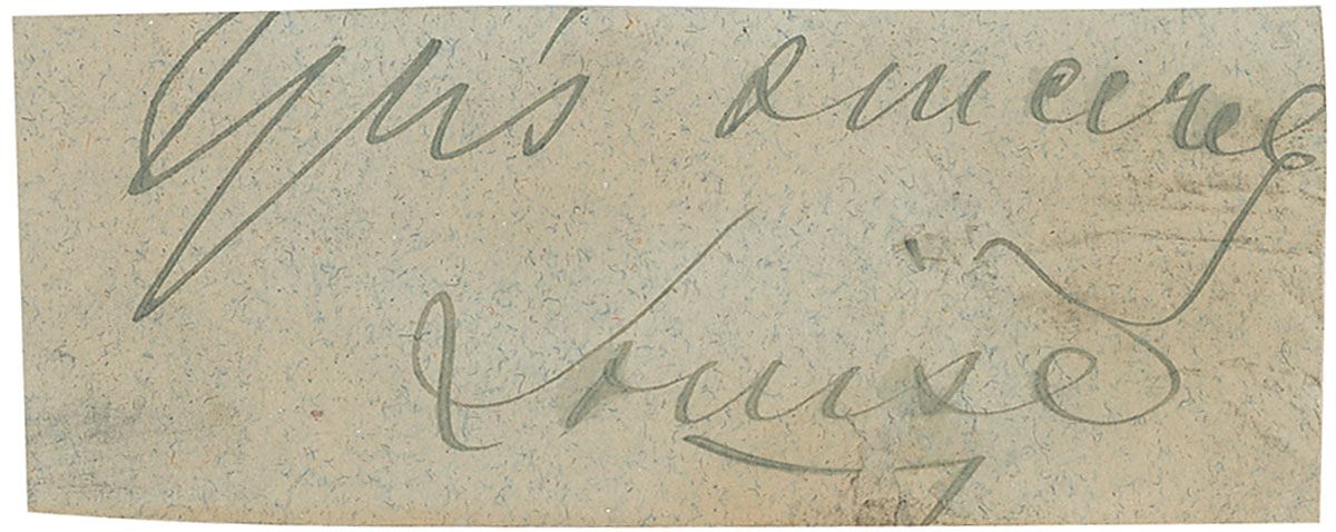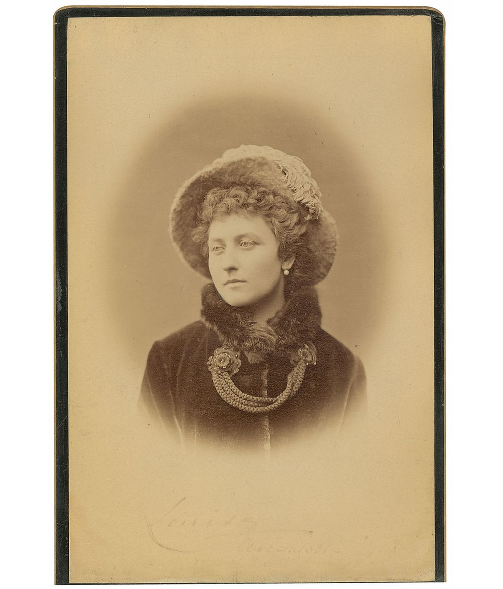 Third child and the eldest daughter of King Edward VII and Alexandra of Denmark (1867–1931). Two items: one 5.25 x 7.75 cabinet-style photo of Louise in a fur coat, faintly signed at the bottom of the image, “Louise, Aug. 1881”; and an ink signature, “Yr’s sincerely, Louise,” on an off-white 3.75 x 1.5 clipped slip. Creases and wrinkling to the slip, trimmed lower edge to the photo, and signature to the photo extremely faint but somewhat visible, otherwise overall very good condition.
