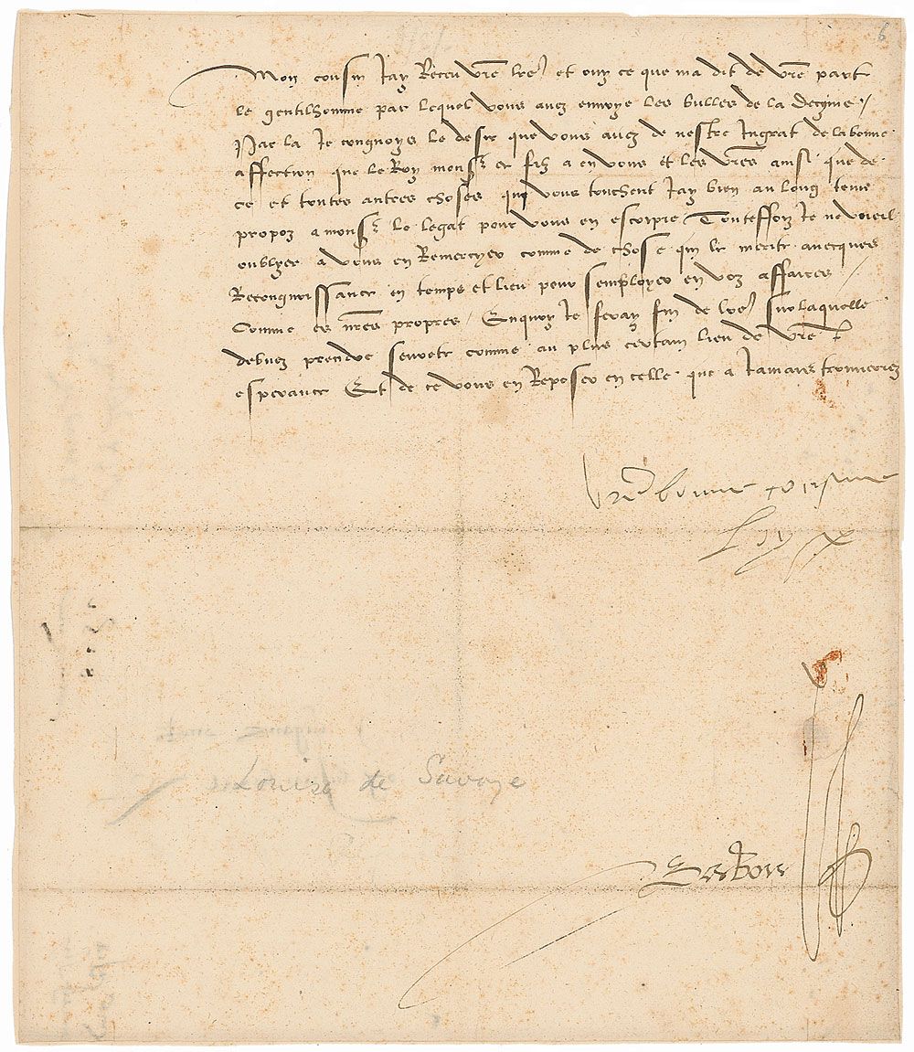 Princess of France (1476–1531) and mother of King Francis I, she served twice as the regent of France in the early 16th century. Rare manuscript LS, with autograph subscription in French, to the Duke of Urbino, one page, 8.25 x 9.5, December, 1518. An interesting letter between heads of State, in which the Princess addresses the Duke as “Mon Cousin.” In very good condition, with intersecting folds (one horizontal fold passing through the signature), and scattered marks and foxing.