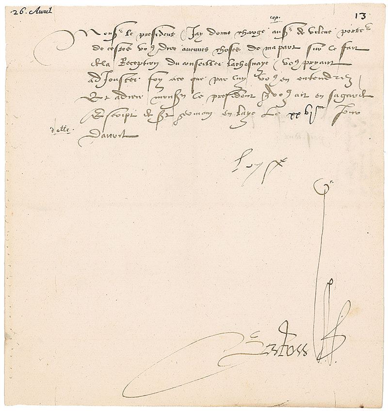 Princess of France (1476–1531) and mother of King Francis I, she played an important political role, serving twice as the Regent of France in the early 16th century. Rare LS in French, signed “Louise,” one page, 8 x 8.25, April 26th [1523], countersigned by Philibert Babou, the kingdom’s treasurer, whose wife became a lover of Louise’s son King Francis I, for whom he built a famous castle. Letter to the first president of Parliament Jean de Selve, (translated): “I have given the sire of Vilene, who will hand you this letter, important instructions on how you should receive counselor La Chesnaye.” In fine condition, with intersecting folds.