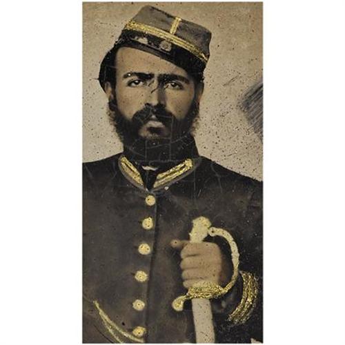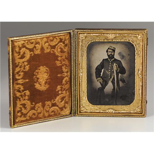 <B>Louisiana Confederate Officer 1/2 Plate Ambrotype.</B></I> The subject's dark good looks strongly suggest that he is an early war Creole Confederate. Additionally, his sword has a distinctive guard associated with those made by Thomas-Griswold & Co. of New Orleans before the city's fall in 1862. These two factors would indicate a Louisiana provenance. The fabric of the officer's uniform is also of the typical dark cloth associated with Louisiana. His kepi, having three horizontal stripes of gold braid, follows the regulations for a Confederate captain, however his tunic is a departure from the norm. It has three horizontal rows of braid on the sleeve as opposed to the braided knots called for in the 1861 C.S. Army manual. The captain's sleeve rank designation here is also out of sync with the two rows of braid on the coat's collar. Regardless, this gentleman presents a formidable martial appearance and he is undoubtedly a Southern officer. As was the custom, the photographer applied gold paint to the uniform's buttons, sword hilt, watch chain and uniform braid. Flesh tones are also lightly tinted. The image shows moderate haloing, has some tiny emulsion cracks and three fingerprints in the right hand field. The case is in remarkably good condition with wear to the high points as expected. A rare Confederate officer's image that would stand out in any collection. Ex. William Turner, author of <I>Even More Confederate Faces</B></I>.<BR><BR><b>Shipping:</b> Small Collectibles (<a target="_blank" href="http://www.heritageauctions.com/common/shipping.php">view shipping information</a>)