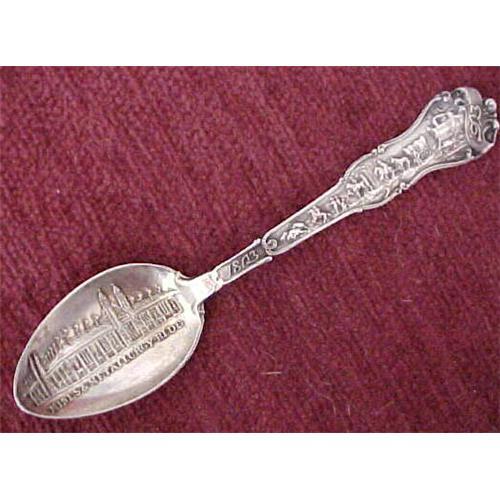 The Louisiana Purchase exposition was held in 1904 in St. Louis to celebrate the 100th anniversary of the Louisiana Purchase, the greatest real estate deal of all times. This spoon is called the Progress of the Louisiana Purchase. The front of the handle features the various methods of transportation used from 1803 to 1903. The bowl has an embossed depiction of the Mines and Metallurgy Building. This spoon measures 4" long and is in extremely good condition. Shipping to US addresses is $3.