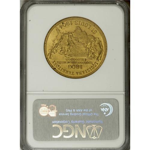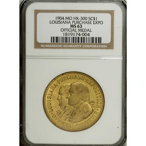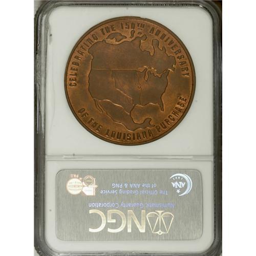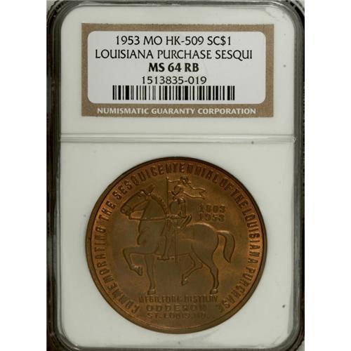 <B>Louisiana Purchase Two-Piece Lot.</B></I> Includes: <B>1904 Louisiana Purchase Exposition Official Medal MS63 NGC,</B></I> HK-300, Napoleon and Jefferson on obverse, map of North America on the reverse, struck in gold-plated bronze; and an <B>1953 Louisiana Purchase Sesquicentennial Medal MS64 Red and Brown NGC,</B></I> HK-509, mounted knight facing left on obverse, North America with artistic license on reverse, struck in copper with reddish-tan and violet surfaces.<BR><BR><b>Shipping:</b> Coin/Currency (<a target="_blank" href="http://www.heritageauctions.com/common/shipping.php">view shipping information</a>)