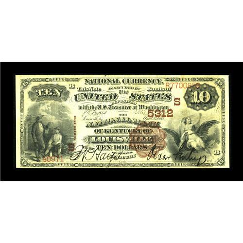 <B>Louisville, KY</B></I> - $10 1882 Brown Back Fr. 490 <B>The NB of Kentucky</B></I> Ch. # (S)5312<BR>While this is certainly not a scarce bank, the $10 Brown Back we offer here is a most attractive <B>Fine,</B></I> with nice margins, considerable crispness for the grade and quite simply a superior degree of eye appeal. Brown Backs have a real tendency to look much nicer to the eye in the middle circulated grades than other Second and Third Charter designs.<BR><BR><b>Shipping:</b> Coin/Currency (<a target="_blank" href="http://www.heritageauctions.com/common/shipping.php">view shipping information</a>)
