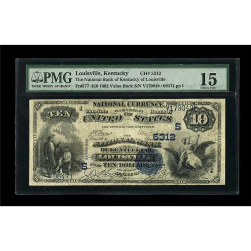 <B>Louisville, KY</B></I> - $10 1882 Value Back Fr. 577 <B>The NB of Kentucky</B></I> Ch. # (S)5312<BR> A pleasing example of this ever desirable type note. <B>PMG Choice 15.</B></I><BR><BR><b>Shipping:</b> Coins & Currency (<a target="_blank" href="http://www.heritageauctions.com/common/shipping.php">view shipping information</a>)