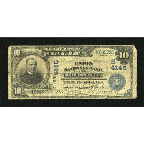 <B>Louisville, KY</B></I> - $10 1902 Date Back Fr. 618 <B>The Union NB</B></I> Ch. # (S)4145<BR> The paper features a fully intact design and remaining signatures of Gettys and Stewart. A couple of pinholes are noted, but do not detract. <B>Very Good.</B></I><BR><BR><b>Shipping:</b> Coins & Currency (<a target="_blank" href="http://www.heritageauctions.com/common/shipping.php">view shipping information</a>)